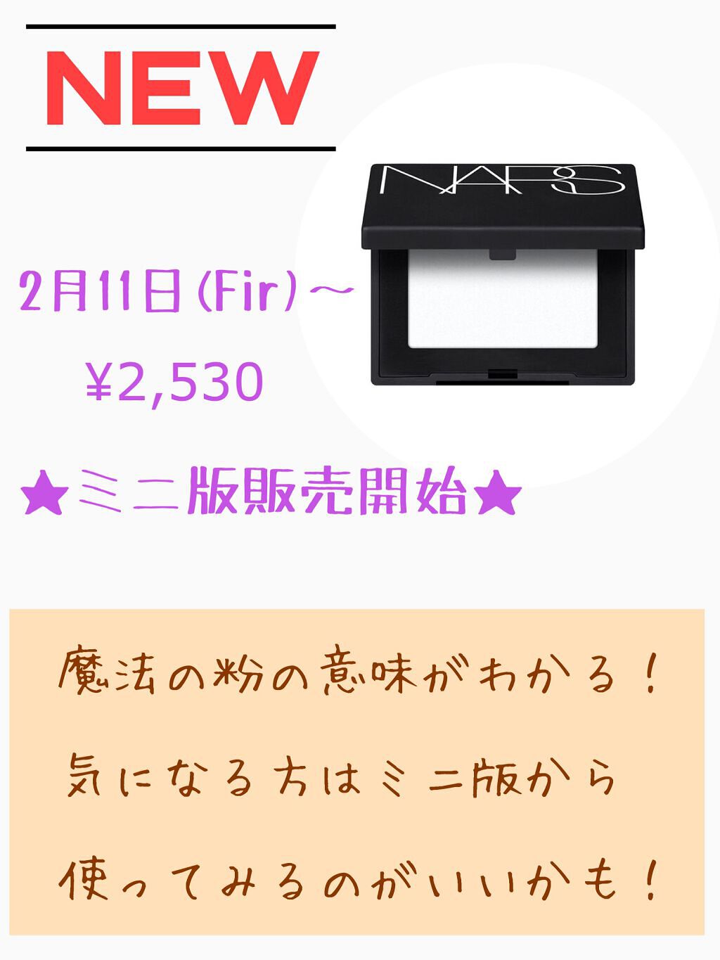 ・使って1日目、乾燥しなくてビックリ! ・つけ心地もサラッとフワッといい香り。 ・つけてる感なく、トーンアップもしてくれる♪ ・種類豊富で自分に合った色が選べる! ・パール入りもとても可愛かった!! ・付属パフも使いやすい! ・夏は全く乾燥しない ・毛穴が目立たなくなる ・崩れにくい ・ついてるか分からないくらい軽いつけ心地 夏は絶対にNARSつかってます! 魔法の粉といわれるワケが使ったらわかる!