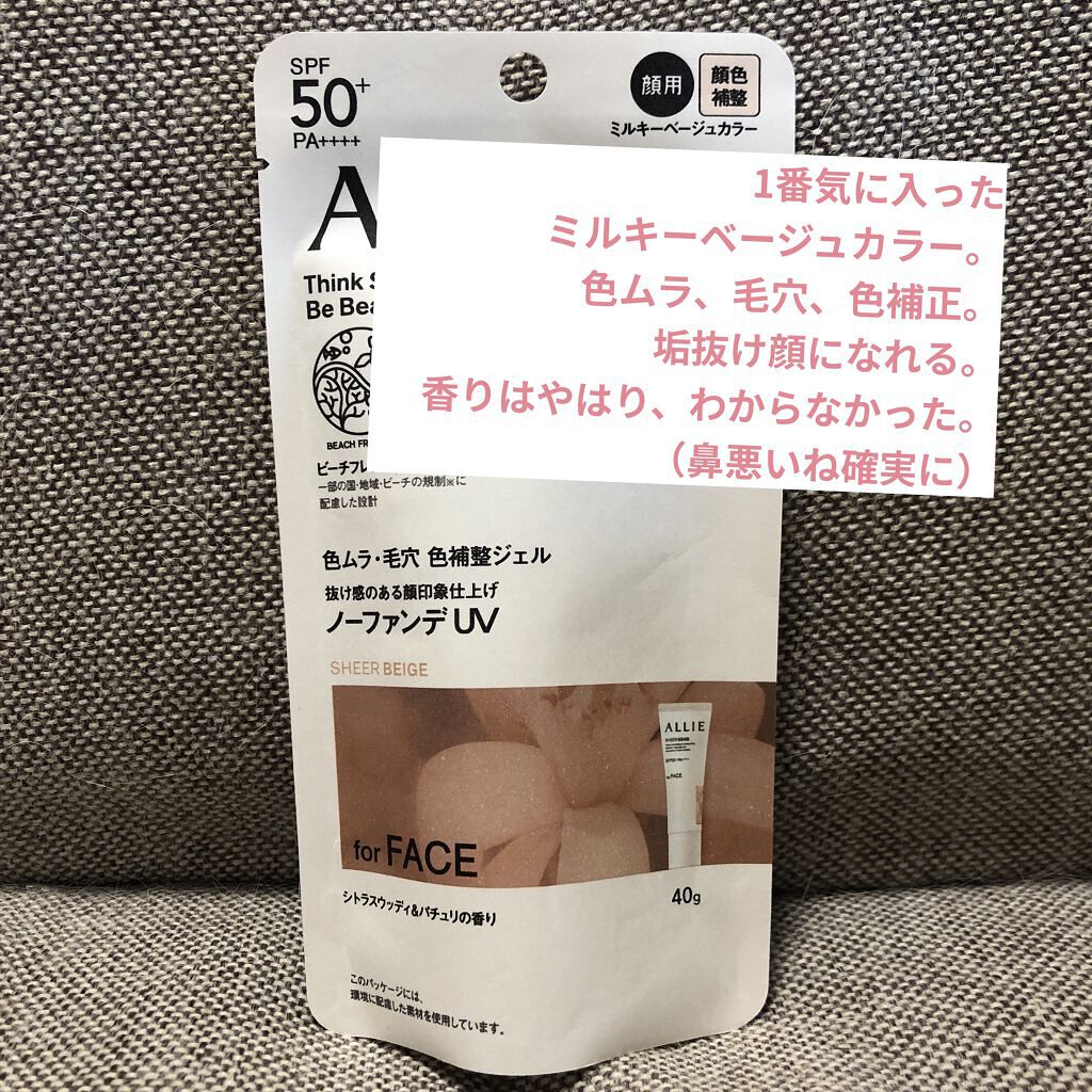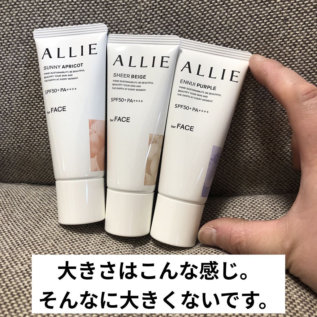- 世界を想う 美しさつづく*1 日やけ止め おでかけも、マスクを外す機会も増える毎日に。 一部の国・地域・ビーチの規制に配慮した設計のビーチフレンドリー処方。 これ 1 本で、UV カット&顔色補整効果でクマ・くすみ・色ムラまでカバー! テカりにくく、くずれにくいノーファンデ UV*2 【ENNUI PURPLE】 くすみや毛穴をカバー 儚げな透明感のある顔印象続く 澄んだ気分を誘う 紫陽花しずく&セージの香り 【SUNNY APRICOT】 クマや毛穴をカバー いきいきとした血色感のある顔印象つづく 思わず出かけたくなる アプリコット&金木犀の香り 【SHERR BEIGE】 色ムラや毛穴をカバー 均一で抜け感のある顔印象つづく 自然で飾らない シトラスウッディ&パチュリの香り ●一部の国・地域・ビーチの規制に配慮した設計の「ビーチフレンドリー処方」 ●SPF50+・PA++++ ●汗・水 こすれに強く落ちにくい フリクションプルーフ・スーパーウォータープルーフ ●ベタつきにくい感触がつづく ●テカりにくくキレイな肌仕上がりがつづく ●環境に配慮した素材を使用したパッケージ採用 ●美容液成分(保湿)ヒアルロン酸Na配合 ●顔用 ●普段のメイククレンジングで落とせる ●マスク・タオル等につきにくい ●化粧下地効果 *1 スキンケア効果またはメイクアップ効果による肌仕上がりのこと *2 ファンデーション未使用時でも、自然なベースメイクが仕上がる日やけ止めのこと *3 チリ・ほこり・PM2.5・花粉等すべての微粒子汚れの付着を防ぐわけではありません 01:ENNUI PURPLE パープル 02:SUNNY APRICOT アプリコットピンク 03:SHEER BEIGE ミルキーベージュ