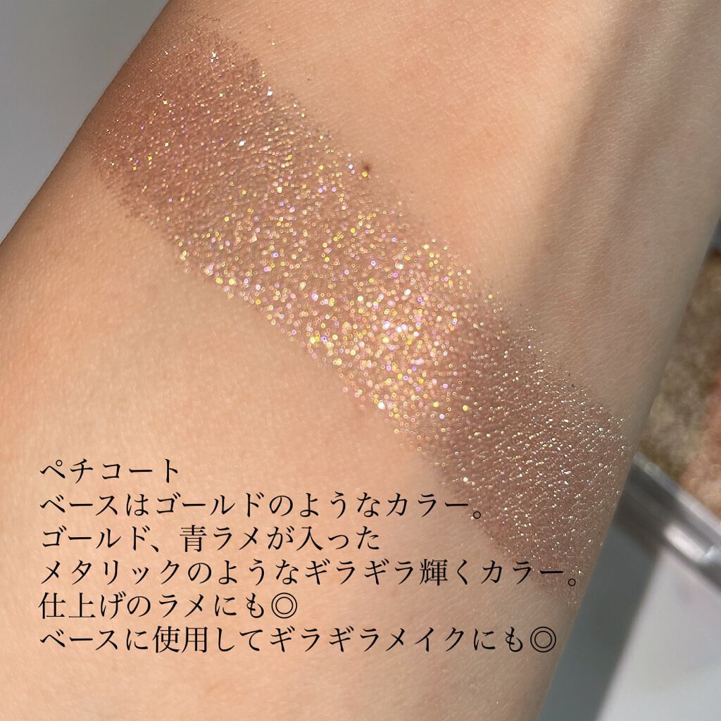 全体的に淡めです! イエベ向きな黄色みのあるブラウン系🤎 シマーなラメが可愛すぎる!! 密着度の高いラメでポンと乗せるだけで キラッキラ✨✨ 粉飛びもしないです! 発色はいいですが淡いので 初心者さんでも使いやすい!!!