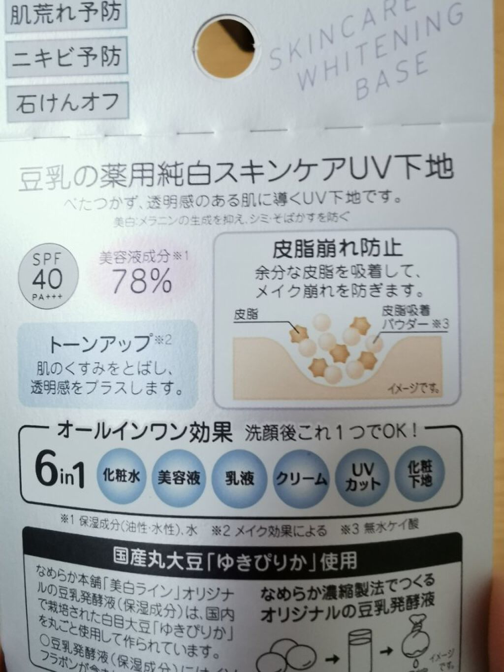 - <薬用美白スキンケアUV下地> 豆乳の美白スキンケアUV下地。肌荒れ&ニキビ予防しながら美白!メラニンの生成を抑え、シミ・そばかすを防ぎます。トーンアップ(メイク効果による)&皮脂崩れ防止。化粧水・美容液・乳液・クリーム・UVカット・化粧下地の1本6役。SPF40・PA+++。[販売名:サナ なめらか本舗 薬用美白スキンケアUV下地]