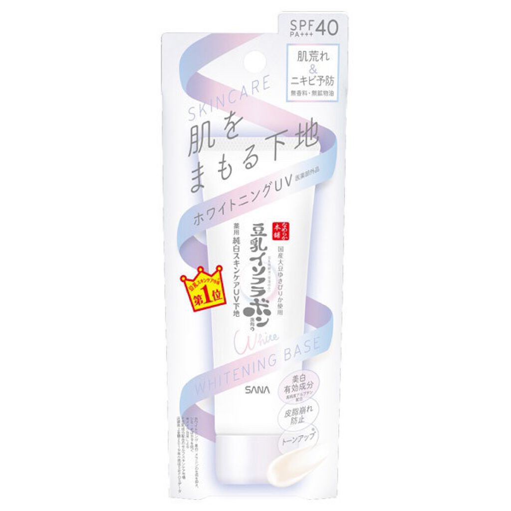 - <薬用美白スキンケアUV下地> 豆乳の美白スキンケアUV下地。肌荒れ&ニキビ予防しながら美白!メラニンの生成を抑え、シミ・そばかすを防ぎます。トーンアップ(メイク効果による)&皮脂崩れ防止。化粧水・美容液・乳液・クリーム・UVカット・化粧下地の1本6役。SPF40・PA+++。[販売名:サナ なめらか本舗 薬用美白スキンケアUV下地]