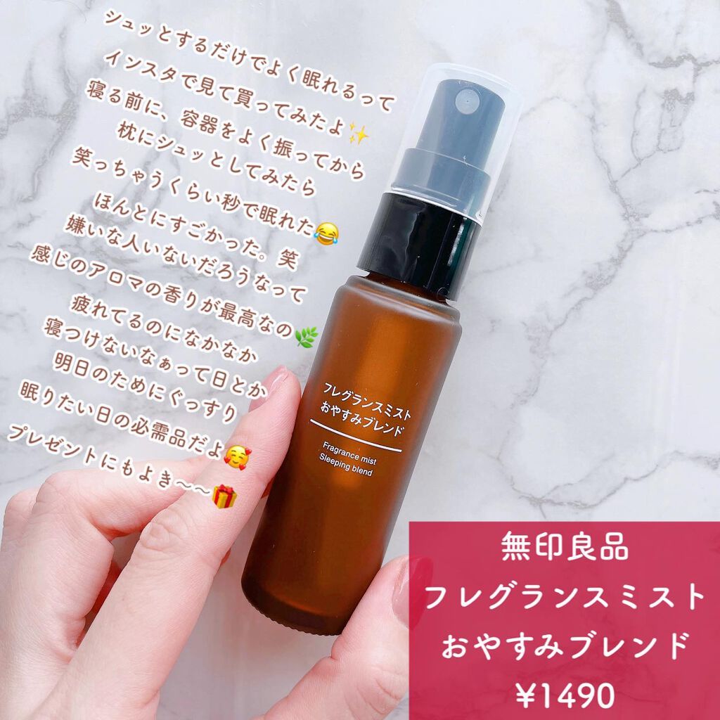 【使った商品】無印良品ルームフレグランススプレー おやすみブレンド【商品の特徴】シュッとひと吹きするだけで、手軽に香りが楽しめるルームフレグランス。寝香水としてもファブリックミストとしても🙆♀️【使用感】元々、おやすみブレンドのオイルが好き...