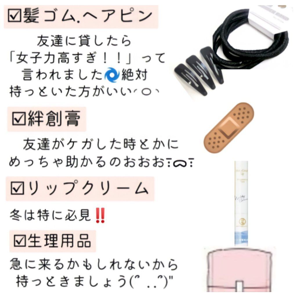 冬は特に必須です! しかも友達の手が乾燥していたりしていたら貸してあげれるので持ってた方がいいです🤤 冬でも日焼けはします!! ミニサイズなのでポーチにも入ると思います︎⸜👍🏻⸝ こんな時期でもありますのでご飯食べ終わった後などに消毒液が必要かと…!! 持っていて損はないです߹ㅁ߹) 友達が欲しい~って時にも貸してあげれる✊🏻 予備のハンカチです! 今の時期には必見ですね! 2~3枚持っとくと︎⸜👍🏻⸝ 前髪命の私には無きゃ無理𖦹 ̫ 𖦹 折りたたみだと良いです🙆🏻 私が使っているのは百均ですっ 友達に貸したら「女子力高すぎ!!」って言われました🌀 絶対持っといた方がいい◜︎࿀◝︎ 友達がケガした時とかにめっちゃ助かるのおおお߹ᯅ߹ 冬は特に必見‼️ 急に来るかもしれないから持っときましょう(՞ . .՞)"