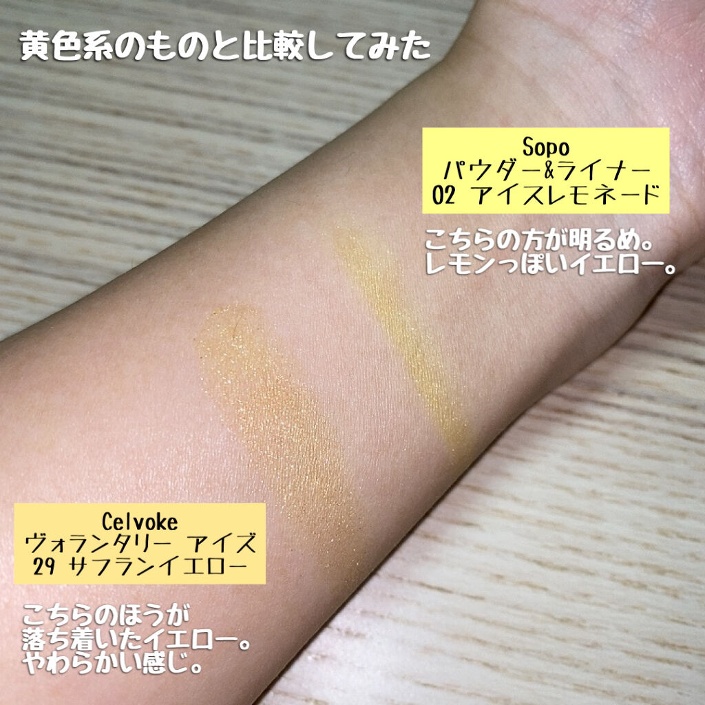 Celvokeのアイシャドウ、2,000円ちょっとでオシャレでちょっと独特な色があったりして、気になる色も多かったりすると思います💭🤍 こちらのサフランイエローもちょっと独特な色かなと思います。個人的には春に咲くお花のようなイメージがあります🌼 こちらの色は、温かみのある黄色でやや落ち着きのある印象があります。明るすぎない。 黄色のアイシャドウは最近増えてきましたが、こちらはわりと先駆けな気がします。 粉質については、しっかりと密着してくれて、ラメ飛びも気になったことはありません。使いやすい質感です。 発色は、1度では強くは発色しませんが、重ねていくことでしっかり黄色感を出すことができます🌼 黄色って夏っぽいイメージがあると思いますが、こちらは合わせ方によっては春に似合う色かなと思っています。優しい色だからかもしれません。