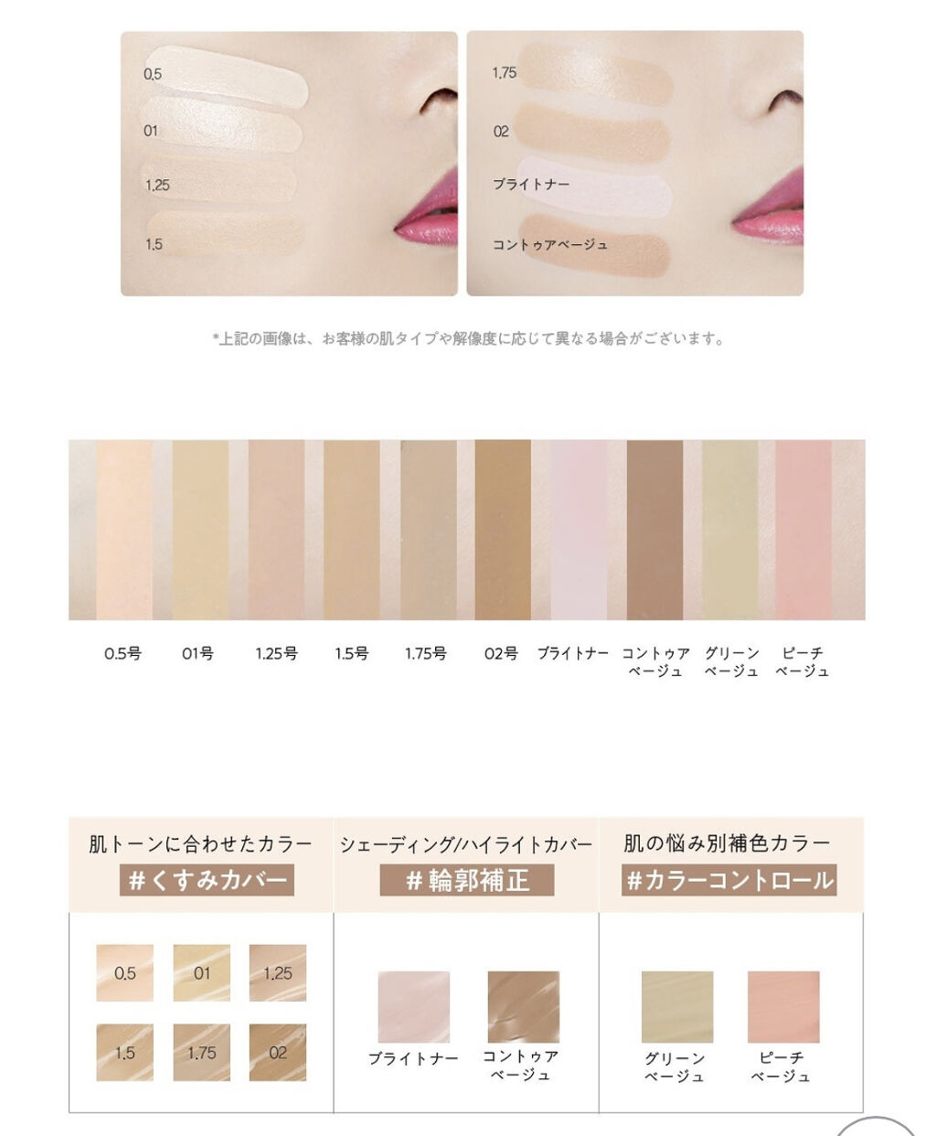 - <0.5アイスベージュ> 酸化チタン,シクロペンタシロキサン,フェニルトリメチコン,タルク,BG,PVP,セチルPEG/PPG−10/1ジメチコン,Pigment Yellow 11,パーフルオロノニルエチルカルボキシデシルPEG−10ジメチコン,(ビニルジメチコン/メチコンシルセスキオキサン)クロスポリマー,アルニカ花エキス,ツボクサ葉エキス,酵母エキス,セイヨウノコギリソウエキス,オウシュウヨモギエキス,アロエベラ葉エキス,ゲンチアナ根エキス,クエン酸,カラミン,ジメチコン,エクトイン,塩化Na,エタノール,水酸化Al,グリセリン,ソルビン酸K,グリコーゲン,安息香酸Na,リン酸アスコルビルMg,ステアリン酸,マンニトール,トリエトキシカプリリルシラン,クロルフェネシン,フェノキシエタノール,ジステアルジモニウムヘクトライト,Pigment Black 11,Pigment Red 101,香料,水 <01クリアベージュ> 酸化チタン,シクロペンタシロキサン,フェニルトリメチコン,タルク,BG,PVP,セチルPEG/PPG−10/1ジメチコン,パーフルオロノニルエチルカルボキシデシルPEG−10ジメチコン,酸化鉄黄,ジステアルジモニウムヘクトライト,(ビニルジメチコン/メチコンシルセスキオキサン)クロスポリマー,オウシュウヨモギエキス,セイヨウノコギリソウエキス,アルニカ花エキス,ゲンチアナ根エキス,酵母エキス,ステアリン酸,リン酸アスコルビルMg,水酸化Al,マンニトール,塩化Na,メチルパラベン,ジメチコン,クロルフェネシン,トリエトキシカプリリルシラン,グリコーゲン,ブチルパラベン,Pigment Red 101,酸化鉄黒,香料,水 <1.25ライトベージュ> 酸化チタン,シクロペンタシロキサン,フェニルトリメチコン,タルク,BG,PVP,セチルPEG/PPG−10/1ジメチコン,Pigment Yellow 11,パーフルオロノニルエチルカルボキシデシルPEG−10ジメチコン,(ビニルジメチコン/メチコンシルセスキオキサン)クロスポリマー,アルニカ花エキス,ツボクサ葉エキス,酵母エキス,セイヨウノコギリソウエキス,オウシュウヨモギエキス,アロエベラ葉エキス,ゲンチアナ根エキス,クエン酸,カラミン,ジメチコン,エクトイン,塩化Na,エタノール,水酸化Al,グリセリン,ソルビン酸K,グリコーゲン,安息香酸Na,リン酸アスコルビルMg,ステアリン酸,マンニトール,トリエトキシカプリリルシラン,クロルフェネシン,フェノキシエタノール,ジステアルジモニウムヘクトライト,Pigment Black 11,Pigment Red 101,香料,水 <1.5ナチュラルベージュ> 酸化チタン,シクロペンタシロキサン,フェニルトリメチコン,タルク,酸化鉄黄,セチルPEG/PPG−10/1ジメチコン,BG,PVP,パーフルオロノニルエチルカルボキシデシルPEG−10ジメチコン,ジステアルジモニウムヘクトライト,(ビニルジメチコン/メチコンシルセスキオキサン)クロスポリマー,オウシュウヨモギエキス,セイヨウノコギリソウエキス,アルニカ花エキス,ゲンチアナ根エキス,酵母エキス,ステアリン酸,リン酸アスコルビルMg,水酸化Al,マンニトール,塩化Na,メチルパラベン,ジメチコン,クロルフェネシン,トリエトキシカプリリルシラン,グリコーゲン,ブチルパラベン,Pigment Red 101,酸化鉄黒,香料,水 <1.75ミドルベージュ> 酸化チタン,シクロペンタシロキサン,フェニルトリメチコン,タルク,Pigment Yellow 11,BG,PVP,セチルPEG/PPG−10/1ジメチコン,パーフルオロノニルエチルカルボキシデシルPEG−10ジメチコン,(ビニルジメチコン/メチコンシルセスキオキサン)クロスポリマー,オウシュウヨモギエキス,ツボクサ葉エキス,アロエベラ葉エキス,ゲンチアナ根エキス,アルニカ花エキス,セイヨウノコギリソウエキス,酵母エキス,エタノール,安息香酸Na,ソルビン酸K,カラミン,ステアリン酸,グリセリン,クロルフェネシン,グリコーゲン,ジメチコン,リン酸アスコルビルMg,塩化Na,マンニトール,ジステアルジモニウムヘクトライト,クエン酸,トリエトキシカプリリルシラン,フェノキシエタノール,水酸化Al,エクトイン,Pigment Red 101,Pigment Black 11,香料,水 <02リッチベージュ> 酸化チタン,シクロペンタシロキサン,フェニルトリメチコン,酸化鉄黄,タルク,セチルPEG/PPG−10/1ジメチコン,PVP,BG,パーフルオロノニルエチルカルボキシデシルPEG−10ジメチコン,ジステアルジモニウムヘクトライト,(ビニルジメチコン/メチコンシルセスキオキサン)クロスポリマー,オウシュウヨモギエキス,セイヨウノコギリソウエキス,アルニカ花エキス,ゲンチアナ根エキス,酵母エキス,ステアリン酸,リン酸アスコルビルMg,水酸化Al,マンニトール,塩化Na,メチルパラベン,ジメチコン,クロルフェネシン,トリエトキシカプリリルシラン,グリコーゲン,ブチルパラベン,Pigment Red 101,酸化鉄黒,香料,水 <2.25サンド> 酸化チタン,シクロペンタシロキサン,フェニルトリメチコン,タルク,酸化鉄黄,BG,PVP,セチルPEG/PPG−10/1ジメチコン,パーフルオロノニルエチルカルボキシデシルPEG−10ジメチコン,(ビニルジメチコン/メチコンシルセスキオキサン)クロスポリマー,Pigment Red 101,ゲンチアナ根エキス,アルニカ花エキス,アロエベラ葉エキス,酵母エキス,ツボクサ葉エキス,ニガヨモギエキス,セイヨウノコギリソウエキス,ステアリン酸,PG,グリコーゲン,クロルフェネシン,安息香酸Na,ク