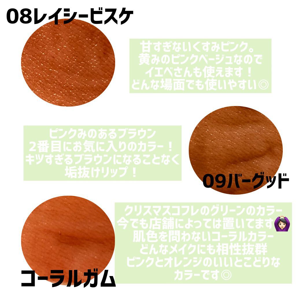 ジューシーリブティント全体に言えることは、おしゃれなのに使いやすい。落ちない。乾燥しない。👏🏻 薄づきも厚めに塗っても素晴らしく可愛い🤦🏻♀️ 01黄みの強いオレンジブラウン06赤みの強いブラウン09ピンクみのある少しグレイッシュにも感じるブラウン パケはサラサラしたマットな質感です。新しく買ったものと前から持ってるものを比べると新しいものの方が蓋が硬い気がします🧐 前から持ってるもので少し液漏れすることがあったので、液漏れ防止でリニューアルされたのかな思いました。新しいものは液漏れなしです◎