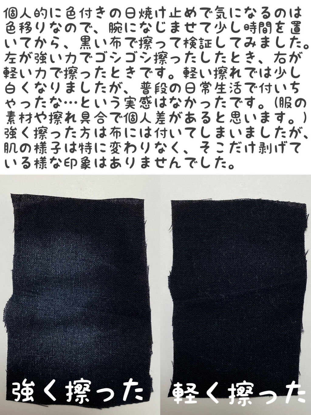 トーンアップするか否かの確認が漏れていて、無色透明のつもりで購入。開封時にパッケージを見てトーンアップやん!?!?となりました。しかしトーンアップと言っても艶で明るく見える程度の仕上がりで好みでした。 無色透明の方がベースメイク前に仕込むのに使いやすく、そのまま首やボディも塗れちゃうので手軽なんですよね。 塗りたては少しべたつくものの、時間が経つとベタつきは感じずしっとりとした触り心地に。