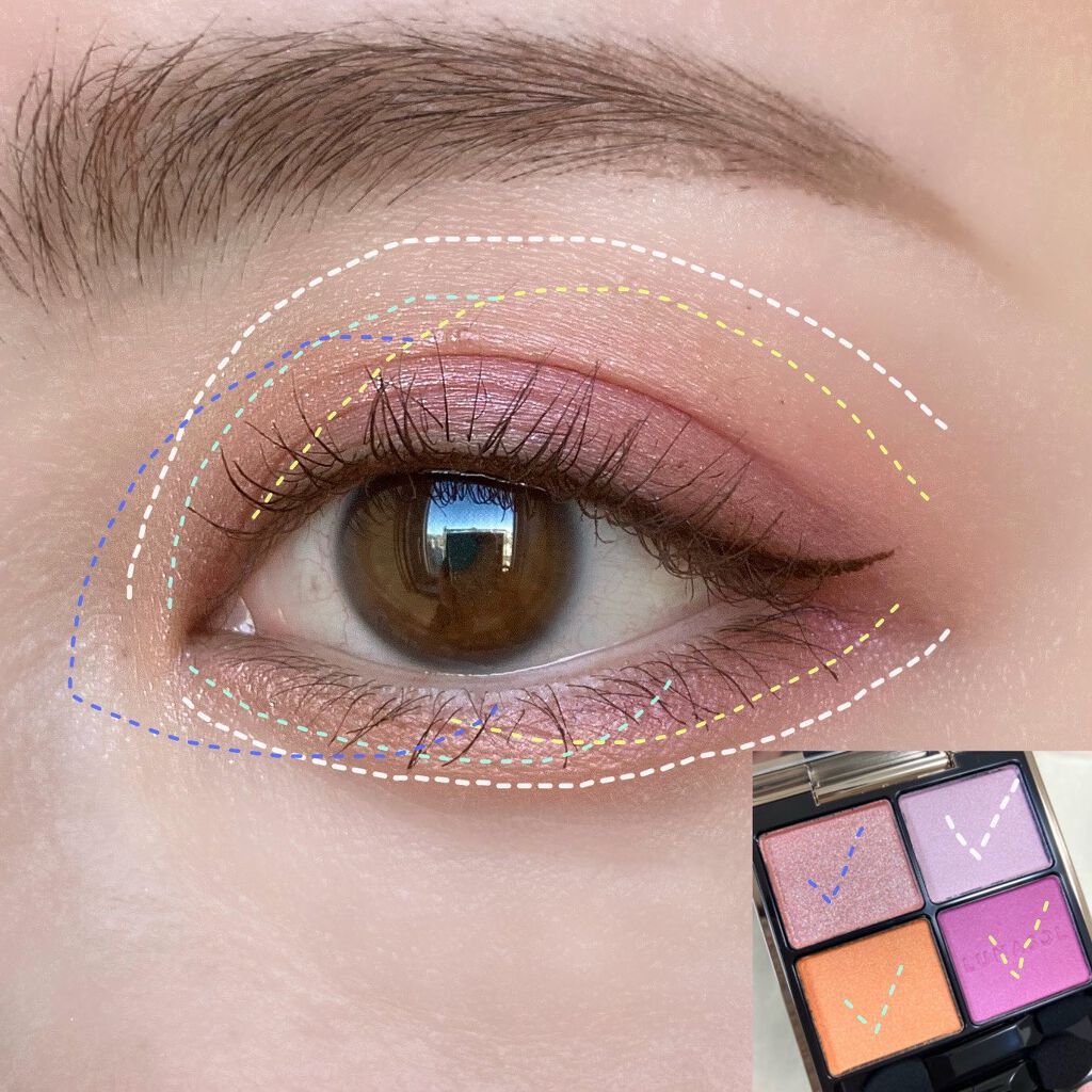 プライマーを使って、密度の高い感じのブラシで 左下ローズを置くように塗る。 ぼかすのは境目だけにして、しっかり色を出す。 右下のダークブラウンと思っていた濃い色は メイクしてみたら結構紫っぽく出たんですが これがまぁくすみ感が強くて…w くすみは何より苦手だよ😂😂 右上のラメはぺかっと光るのがとっても良い!!🤩 割とシンプルなメイクになるな~と思うけど しっかり色出せたので無事使っていけそうです💃🏼💓