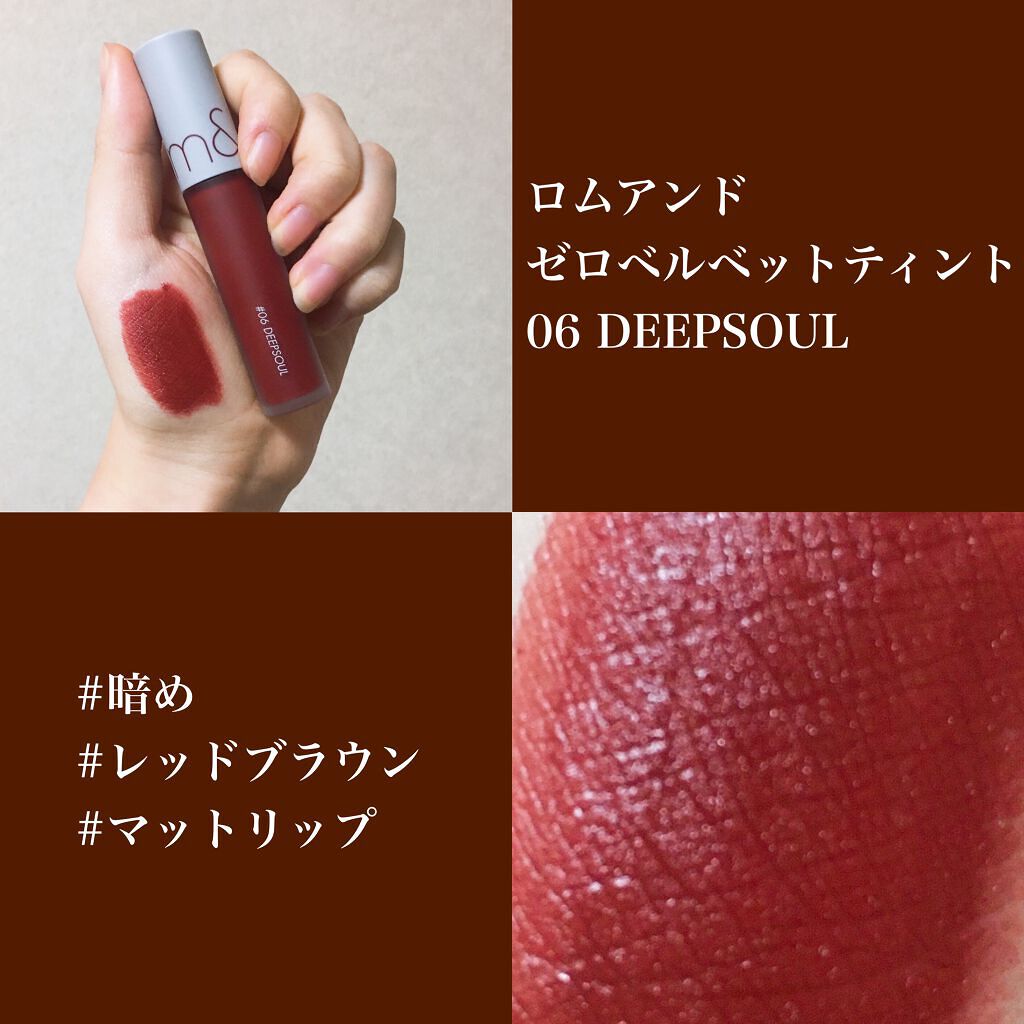 rom&ndのゼロベルベットティントはマットリップの中でも乾燥しにくく、内側で水分が保たれてるような質感です! 色持ちが◎です🙆🏻♀️︎🙆🏻♀️︎rom&ndの時点で色持ちが良いってことは周知の事実かもしれないですね、、 06のディープソウル(DEEP SOUL)はイエべ秋さんにおすすめのブラウンレッドカラーです!