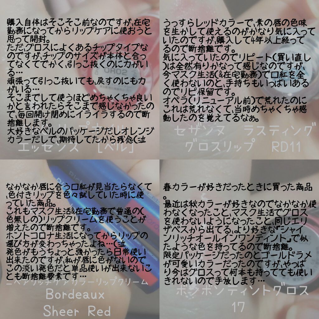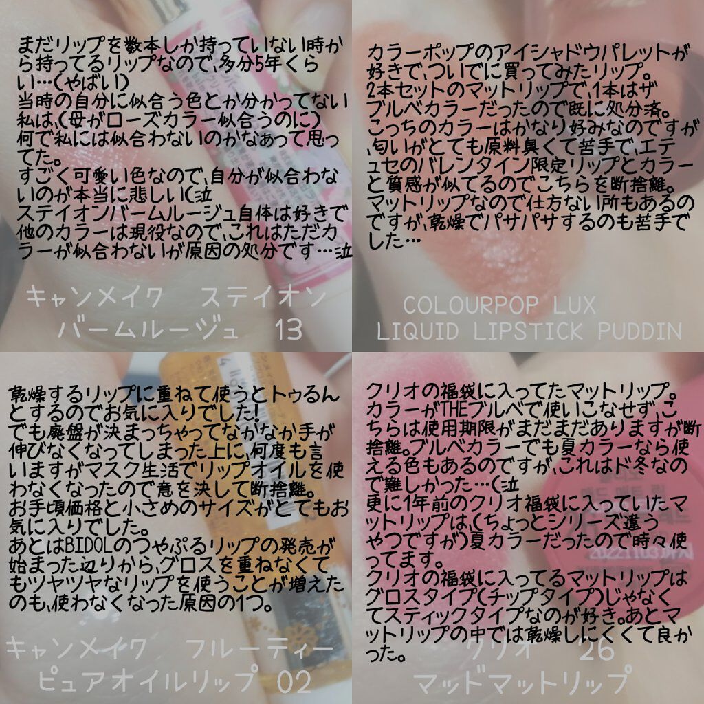 ・乾燥しない・(私唇荒れやすいのですが)荒れない・しゃべっても落ちにくい・つやぷるな唇に! ・繰り出したら戻らない・匂いに好き嫌いがある(カラーや販売タイミングによって香りが異なりますが、オレンジピーチやグレープフルーツ)・暑いところで保管、使用すると溶ける