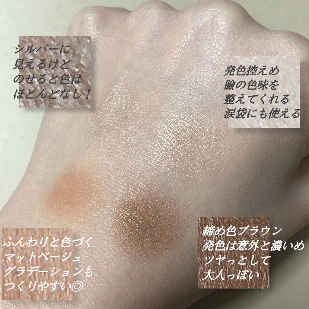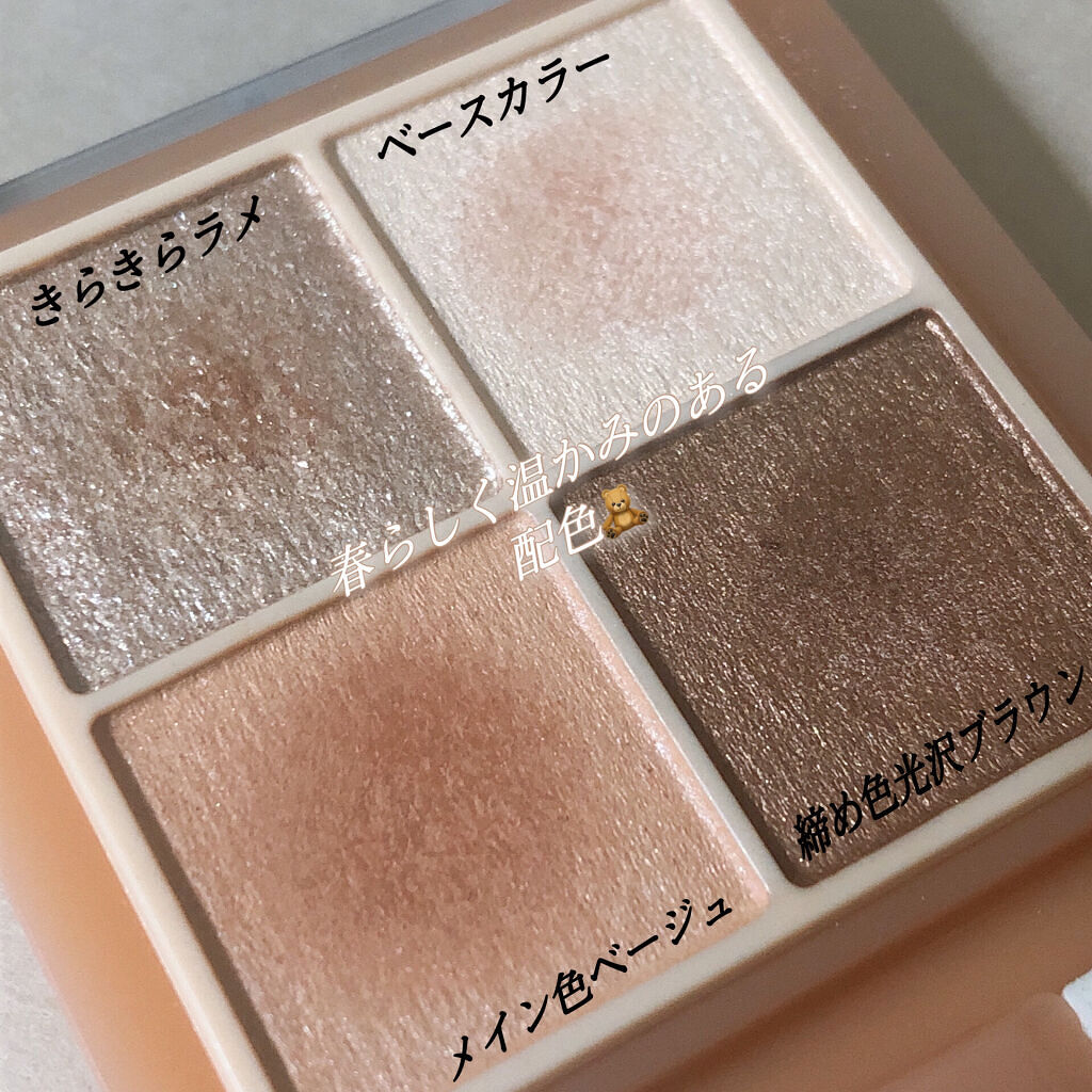 - ラメ・パール・マット3質感の4色アイシャドウ。 肌馴染みの良いベージュを基調としたカラー。ラメ・パール・マットの3質感を重ねて、自然にまぶたを強調し奥行のある大きな目元へ。 しっとり溶け込むような柔らかなパウダーなので、スルスル伸びてまぶたにピタッと密着。保湿成分(スクワラン・ホホバ種子油)配合。