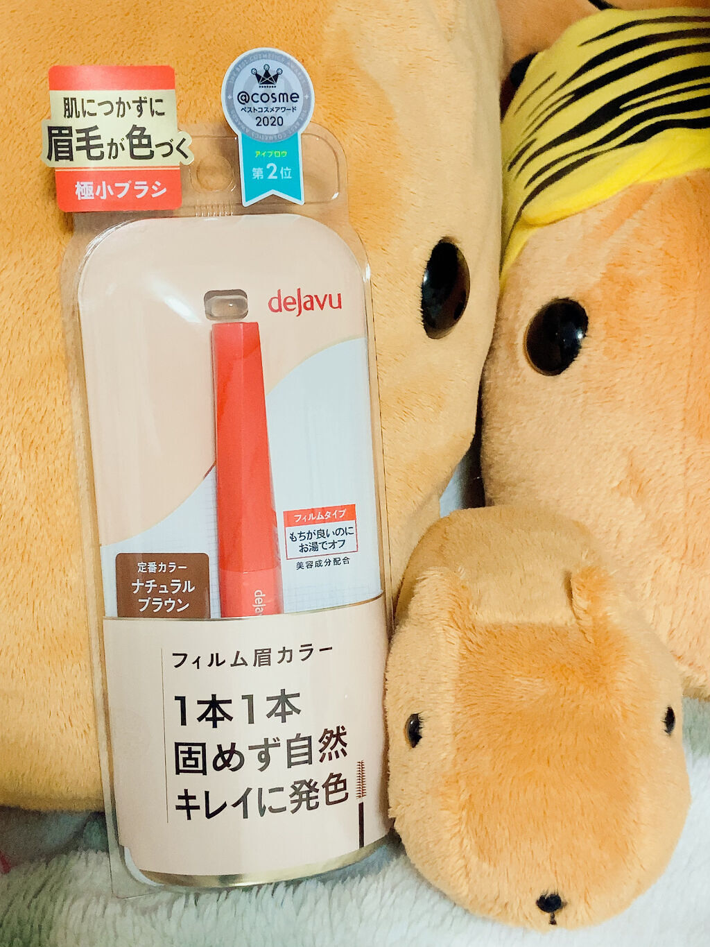1本1本色づき固まらない「フィルム眉カラー」 塗りやすい極小ブラシで簡単垢抜け✨ デジャヴュ独自の薄膜フィルムを採用。 毛がパリッと固まらず、タバやダマのないふんわり自然な眉に。 フィルムタイプで速乾性が高く、皮脂・汗・こすれに強いのに、お湯だけで簡単に落とせます✨