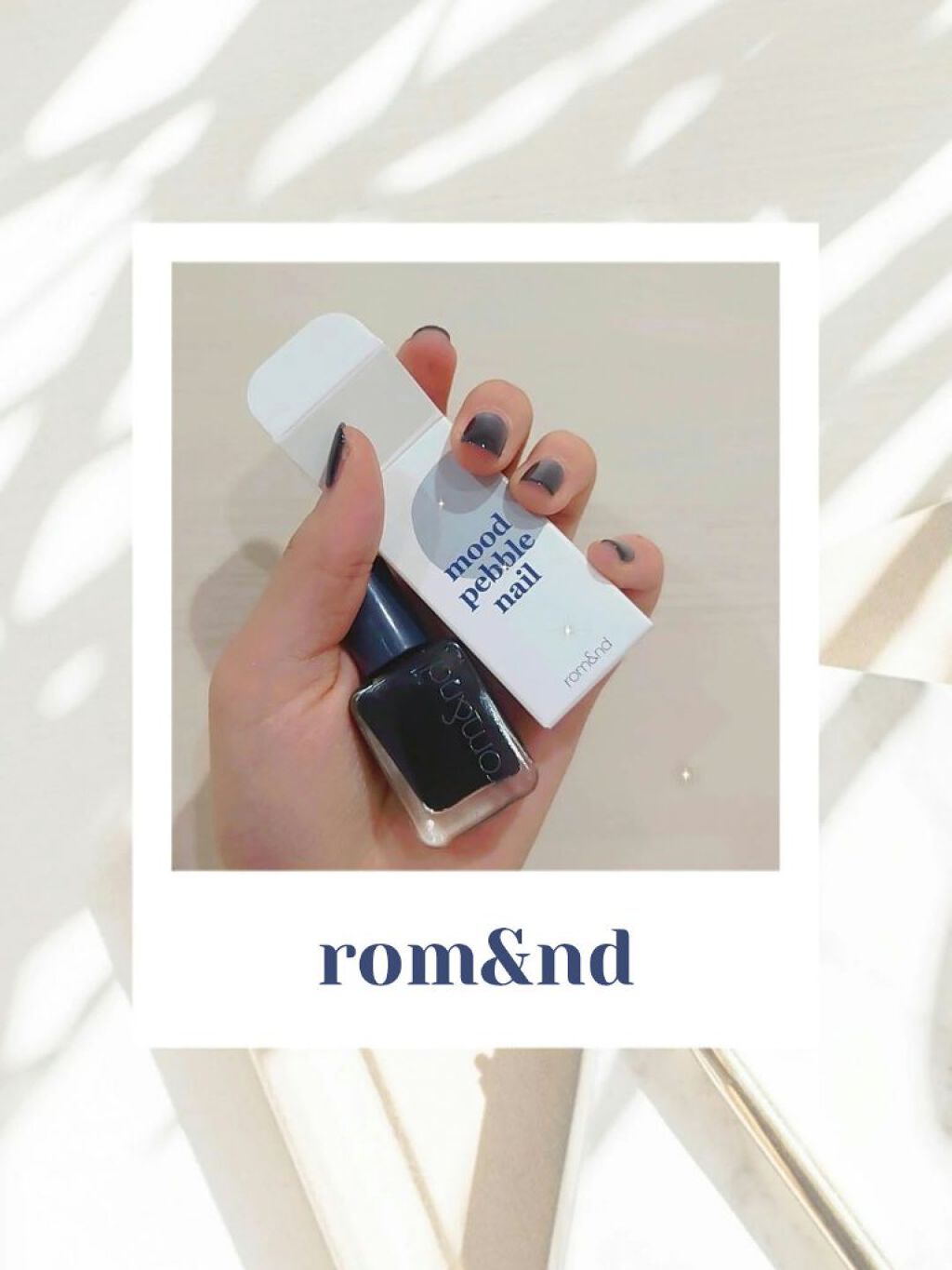 - 指先に玉石のような、ならかな光沢をとどめる。塗った瞬間から綺麗なツヤと光沢を維持し、重ねて塗っても透き通ったカラー感を鮮やかにとどめる、素早い乾燥力のナチュラルカラーネイル。「ロムアンド」の次世代型ネイルです。