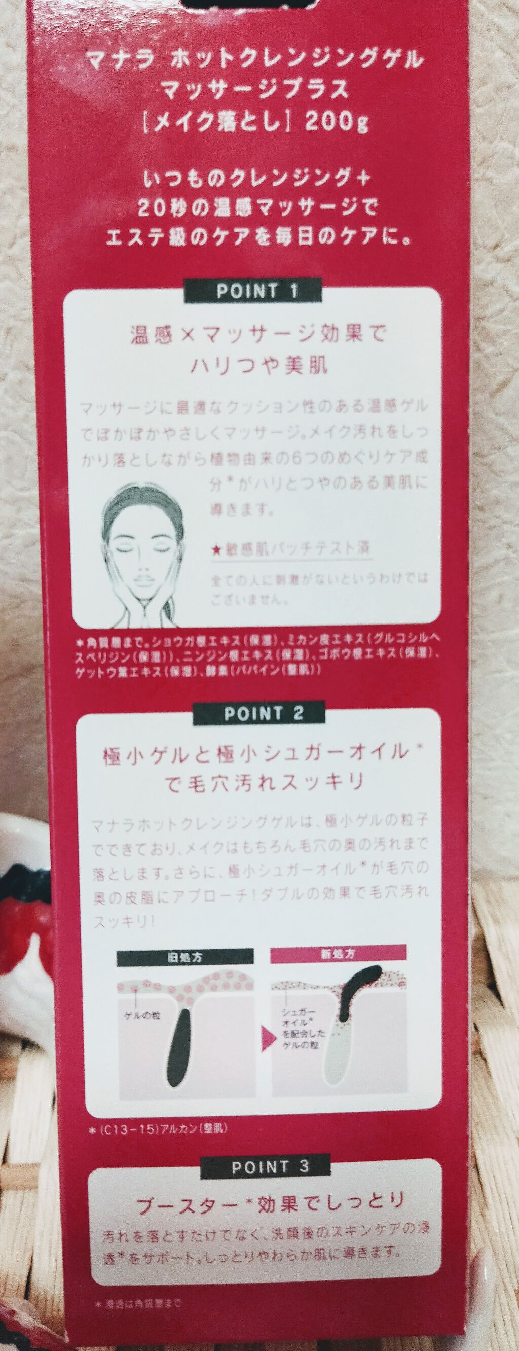 - POINT1 メイクを落としながらマッサージが可能に マッサージをすることで美容成分がはじけ、メイクや黒ずみ汚れを絡め取るものと、肌にうるおいとして残るものとに分かれ、洗い流してもツルツルに! クレンジング後のプラス20秒のマッサージは、毎日でもしていただきたいほどおすすめです。さらに、敏感肌パッチテスト済み*1。 *1 全ての方に刺激がないというわけではございません。 POINT2温感マッサージでハリと透明感アップ! 温感処方によるスチーム効果とマッサージで、硬くなった肌と毛穴を和らげるだけでなく、クレンジングタイムを至福のひと時へと導きます。 6つのめぐりケア成分を追加、さらにハリのある、つややかな肌へと導きます。*1 角質層まで *2・4・5・6 保湿成分 *3 グルコシルヘスペリジン(保湿成分) *7 パパイン、アルギン酸Na(整肌成分) POINT3極小マイクロゲル & 極小シュガーオイル*1で毛穴の奥から汚れを落とす 毛穴よりも小さなマイクロサイズのゲルと極小シュガーオイル*1で、毛穴の奥まで汚れを取り除き、毛穴の目立たない滑らかな仕上がりへ。 *1 (C13-15)アルカン(整肌成分) POINT4 91.3%が美容液 まるで高級な美容液のように、91.3%が美容液成分でできているクレンジング。汚れはしっかり取り除くのに必要なうるおいは肌に残すので、毛穴も目立たなくなり、使う度にうるおいに満ちてハリのあるみずみずしい肌へと導きます。*1 セレブロシド(保湿成分) *2 保湿成分 *3 加水分解コラーゲン、ダイズ種子エキス、セイヨウトチノキ種子エキス、メマツヨイグサ種子エキス、ザクロ果実エキス、プエラリアミリフィカ根エキス(整肌成分) *4 フウチョウソウ葉エキス(整肌成分) *5 パパイン、アルギン酸Na(整肌成分) POINT5マナラこだわりの「7つの無添加」 着色料 合成香料 鉱物油 石油系界面活性剤 エタノール 紫外線吸収剤 パラベン 効果実感はもちろん、肌へのやさしさもとことん追求。デリケートなお肌の方にも喜ばれていいます。 POINT6 1本で8つの機能 〈ホットクレンジングゲル〉は、1本でクレンジング・洗顔の役割を果たすのでダブル洗顔不要。 さらにクレンジング後の肌を和らげ、スキンケアの浸透*2を助けるブースター*2の役割も果たします。*1 毛穴の黒ずみ汚れを洗い流すこと *2 浸透は角質層まで *3 マッサージ行為による