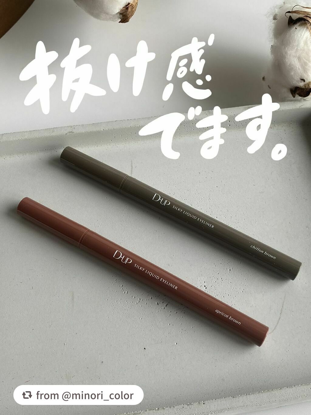 - 筆先までずっとなめらか、目尻で感動するリキッドアイライナー。 必要な量が肌にのる新設計で、まぶたの上をすべるような、滑らかな描き心地。しなやかでコシのある筆が、筆圧のコントロールを容易にし、太いラインも細いラインも思い通りに仕上げます。水、汗、涙に強いウォータープルーフタイプなのに、通常洗顔で簡単オフ。肌に色素が残らない顔料を使用。5種類の美容液成分を従来品の200%配合し、メイクしながら目元ケアまで。 ●ブラウンブラック ※2020年9月12日 バラエティショップ先行発売 ●漆黒ブラック ※2020年12月頃発売予定 ●ナチュラルブラウン ※2020年12月頃発売予定 ●シフォンブラウン 「毎日メイクに透明感と抜け感」 ブラウンでも、グレーでも、ベージュでもないニュアンスカラー。 自然な印影で素の目元を際立て、頑張りすぎない、ふんわりとした目元に。 ●アプリコットブラウン 「じゅわっと血色感。 肌に馴染むおしゃれカラー」 温かみのあるアプリコットがじゅわっと滲む血色感を目元に演出。 肌馴染みが良いので、カラーライナーに抵抗がある方もブラウンの延長線上で楽しめる、使いやすい色味です。 ”ちょっとオシャレ”な空気感を演出するカラー。 ●ピンクショコラ アイライナー 「ピンクが溶け込む濃厚ブラウン」 肌馴染みが良く、目元にじんわり血色感をプラス。 さりげなく女性らしさが加速するようなカラー。 ●ピスタチオラテ (2022年7月29日(金)発売) 「“目尻”に抜け感アクセント」 肌に馴染むのに映える絶妙なグリーン。 トレンドカラーに“くすみ”と“抜け感”をプラスしたまろやかな発色。 ●マスタードブラウン 「“イエロー”が揺れる、大人の洒落色」 (2022年7月29日(金)発売) まるで太陽のような暖かさを感じる新しいブラウン。 ほんのり感じるイエローでメイクが一気に垢抜ける稀有な色。 ●シフォンピンク(2023年2月10日発売) 「ふんわり柔らか"まろみピンク"」 甘くなりすぎない青みニュアンスで目元の透明感UP。 目元を引き締め、ピンクメイクにありがちな腫れぼったさを解消。 ●ミルクカプチーノ(2023年4月21日発売) まろやかな深みの“優しい締め色” どんなメイクにも合わせやすいカラー。 自然な陰影でさりげなく目幅を拡張します。 ●グレーカシミア(2023年10月1日発売) ブラウンがほんのり溶け込んだ、暖色グレー まろやかな発色で、パーソナルカラーを問わず肌に馴染む 目元の陰影になりすまし、抜け感と目力を欲張りに叶える ●ダークフィグ(2024年6月1日発売) するする”なめらか。描きやすいのに、落ちにくい。 クッキリ可愛いほの甘ダークブラウン ●ピーチモカ(2024年8月1日発売) ふわっと自然に盛れる“桃色ブラウン” ほんのり血色感で目元にうるみ感を演出 ●スターダストブラウン(2024年12月11日発売) キラッと繊細に輝く''星屑ブラウン'' 透け感のあるダークブラウンの色味とラメの輝きが、目元に艶のある立体感を演出 ●チャコールモカ(2025年4月10日発売) 目元を締める''深みグレージュ'' 黄みや赤みに偏りすぎない絶妙な色設計で、自然に目元を強調