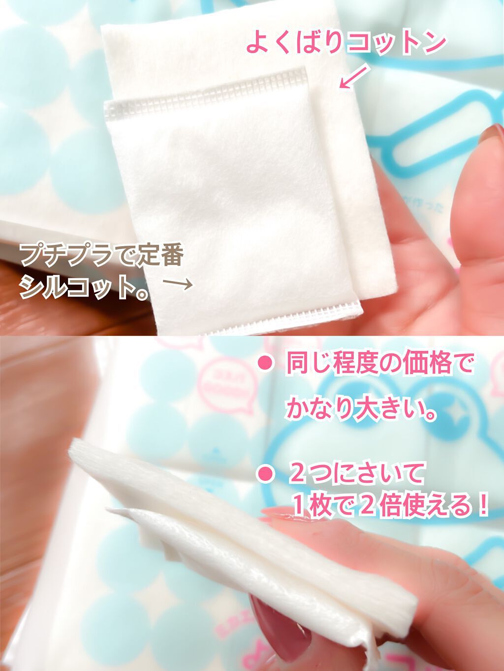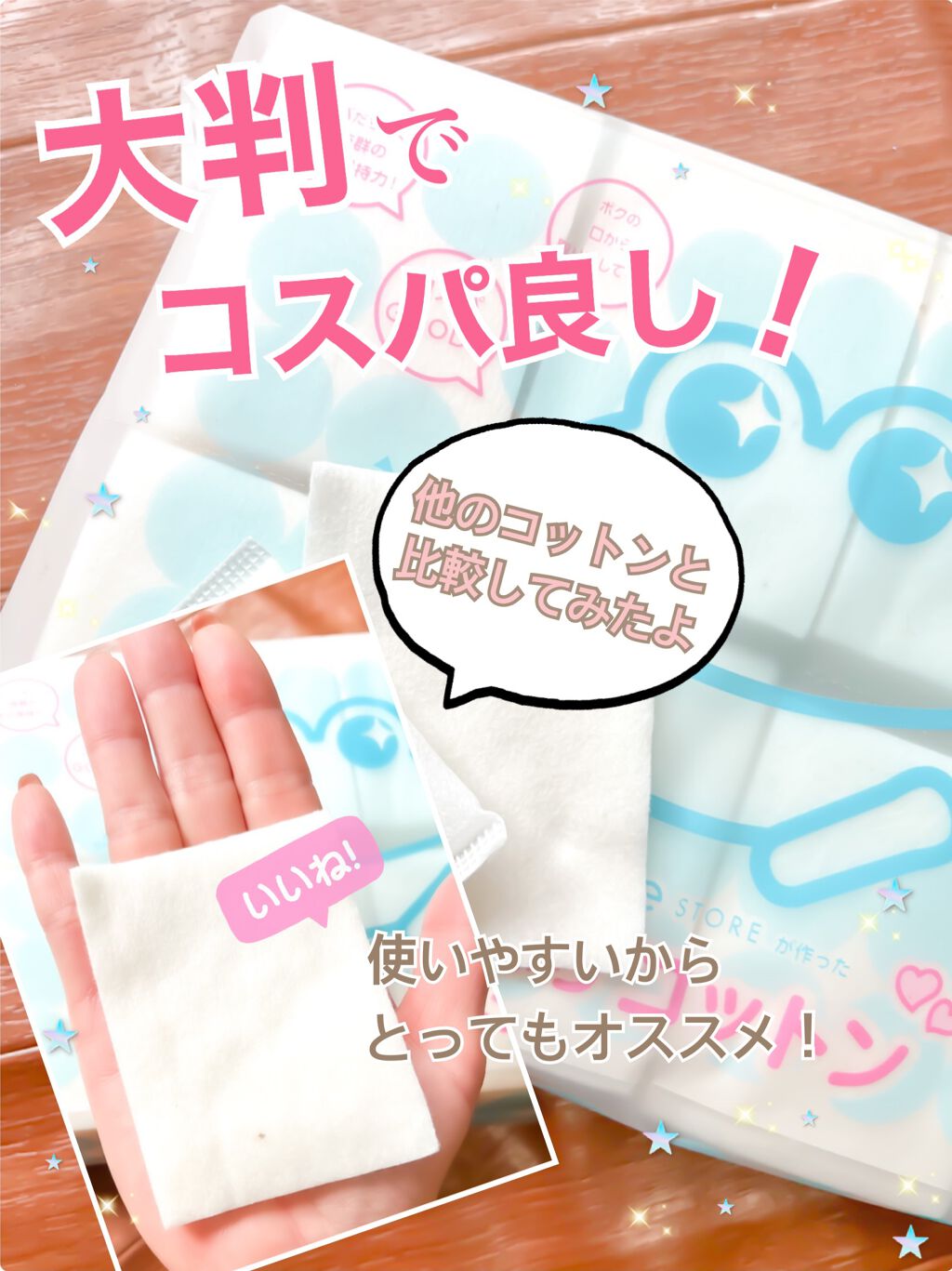 120枚入りの大容量なコットンです。 サイズは大きめなので化粧水を含ませてマスクにするのにも◎ 拭き取り化粧水をつけて使用していますが拭き取り後もそこまで毛羽立たないので肌にコットンが付きづらいのが嬉しいですね😊 コスパを考えるとかなりおすすめです✨