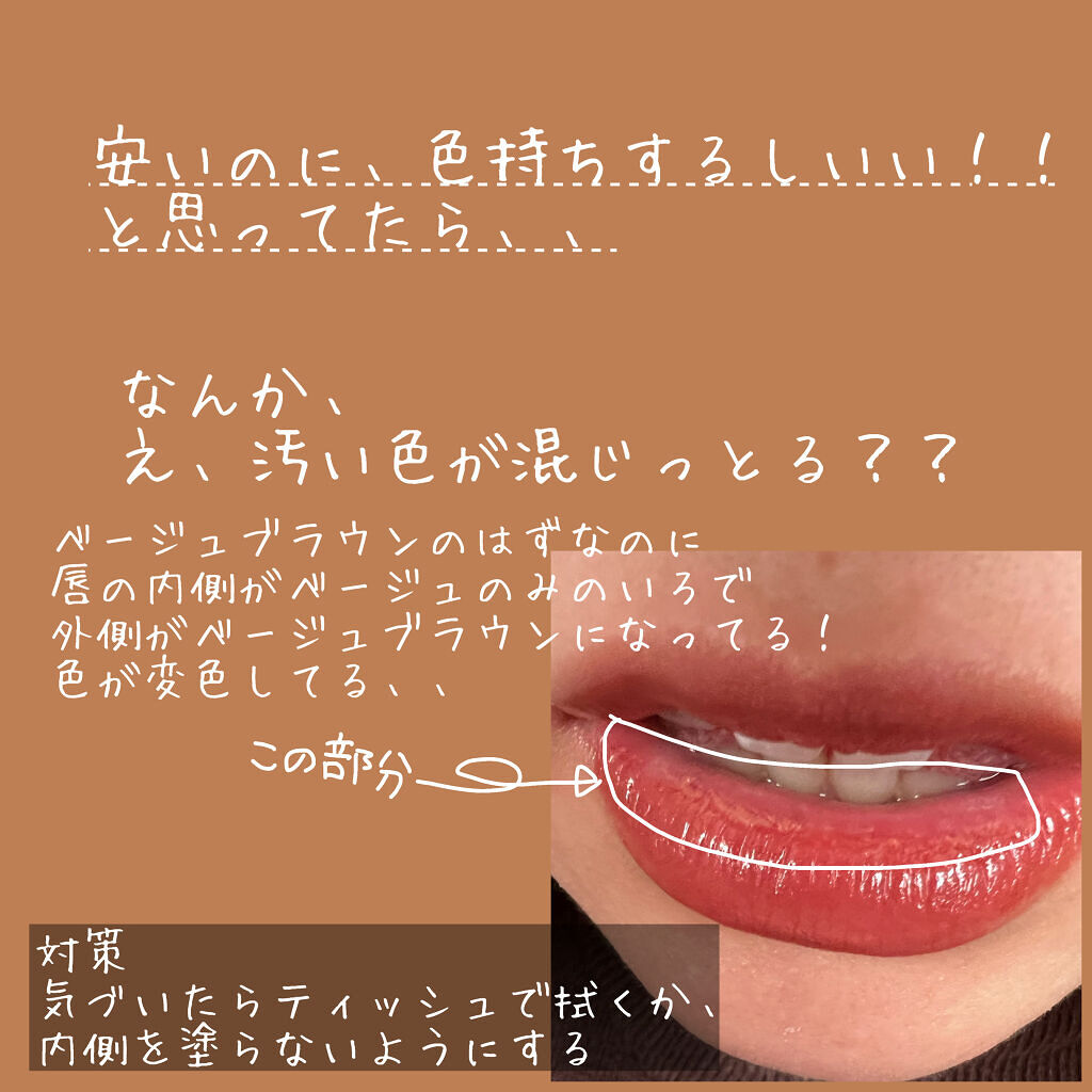 ✔️カラバリ良き ✔️唇の内側色が汚い くちべにをなじませるのによくやる「んまっ」をした後、汚い色のベージュが浮き出てきて せっかく可愛いベージュブラウンが変になりました。 普通に過ごしてても口をいーーってしでも出てくるのでティッシュで拭いては塗り直したりしてます。 内側に塗るのはやめておいたほうがいいと思います。 ✔️色落ちが汚い 下唇だけとか 縦じわにのこる 結局塗り直したりですね ✔️唇荒れる 皮剥けやすくなります