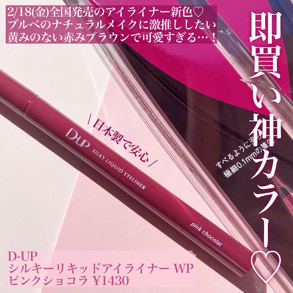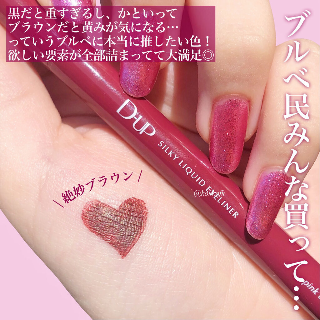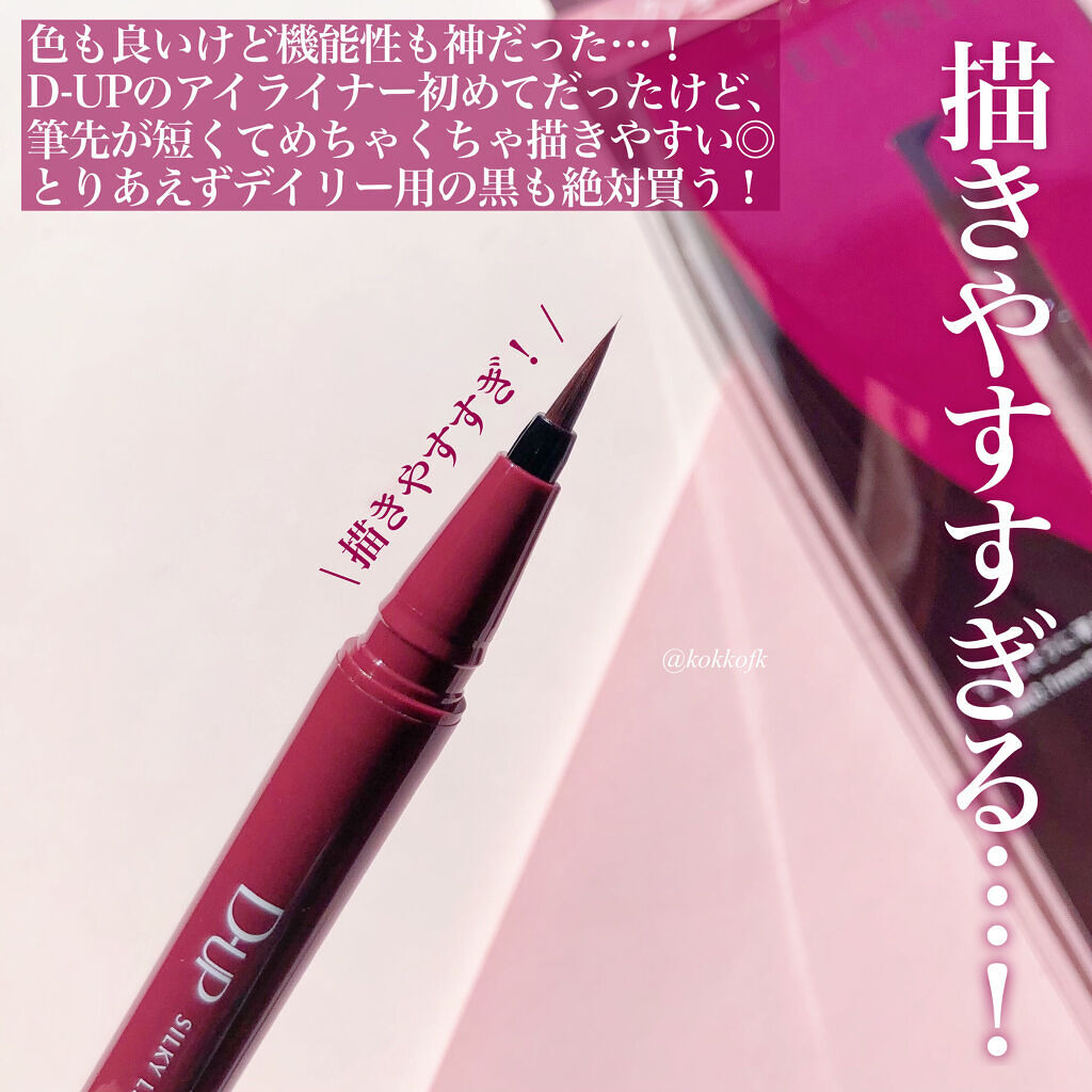 D-UPシルキーリキッドアイライナーWPダークフィグ黒すぎない濃い目の色が欲しくなり購入🫰お客様にもD-UPの種類を使うんだけど目尻の延長線も書きやすいです✨ヨレにくいと思う!美容成分配合なのも嬉しい👏メンズメイクでも使ったけどキレイに仕上が...