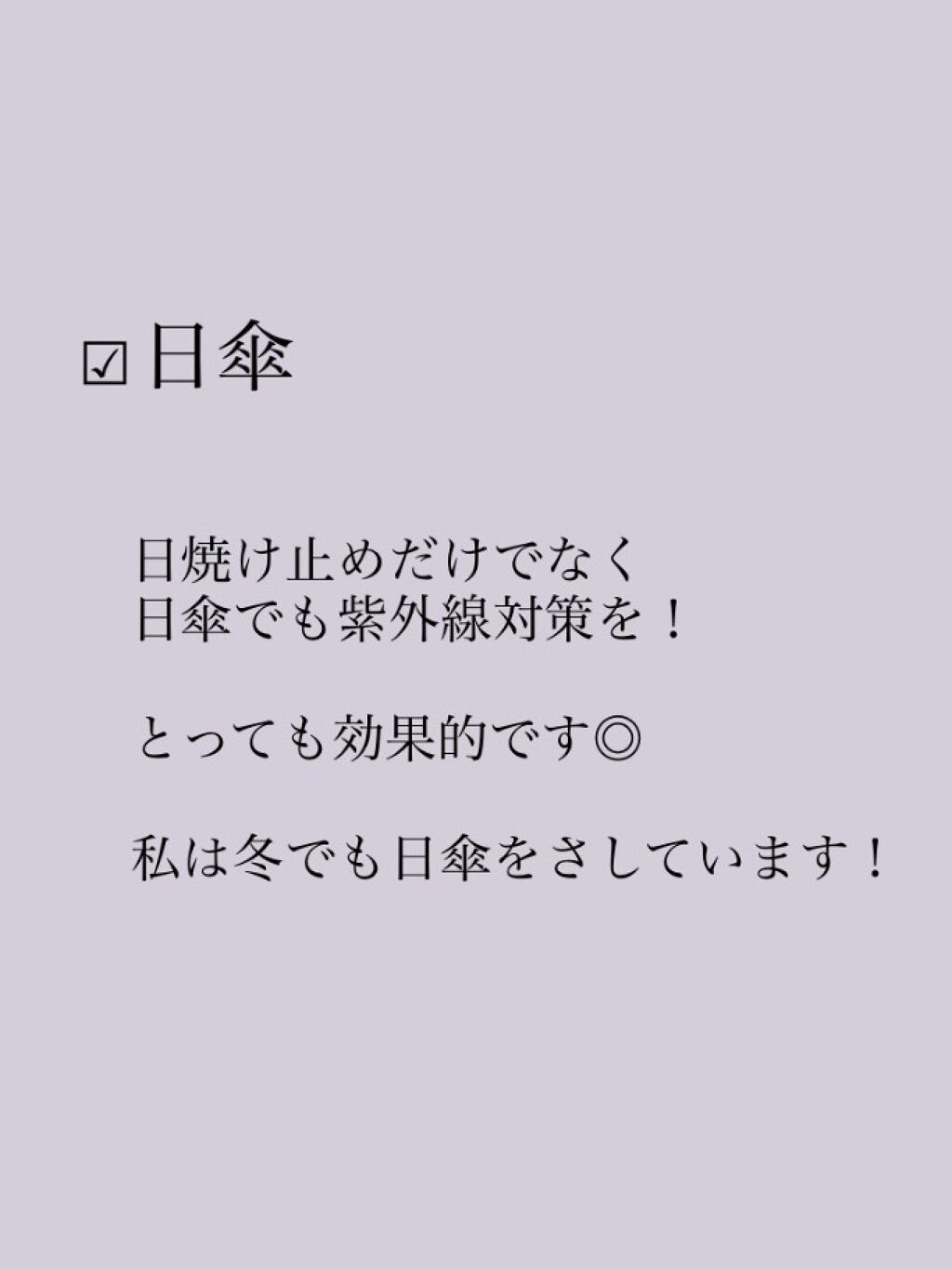 日焼け止めのほかに 日傘や帽子を使って紫外線対策💪🏻 おすすめ日傘は 遮光率100%のサンバリア100 高い😭!高いけど、買って損はなしです! オススメハーブティーは ローズヒップティーです♡ ビタミンCの爆弾とも言われてるくらい ビタミン豊富なのでオススメです 時間はかかるかもしれなけれど あなたががんばっているケアは 無駄じゃない!