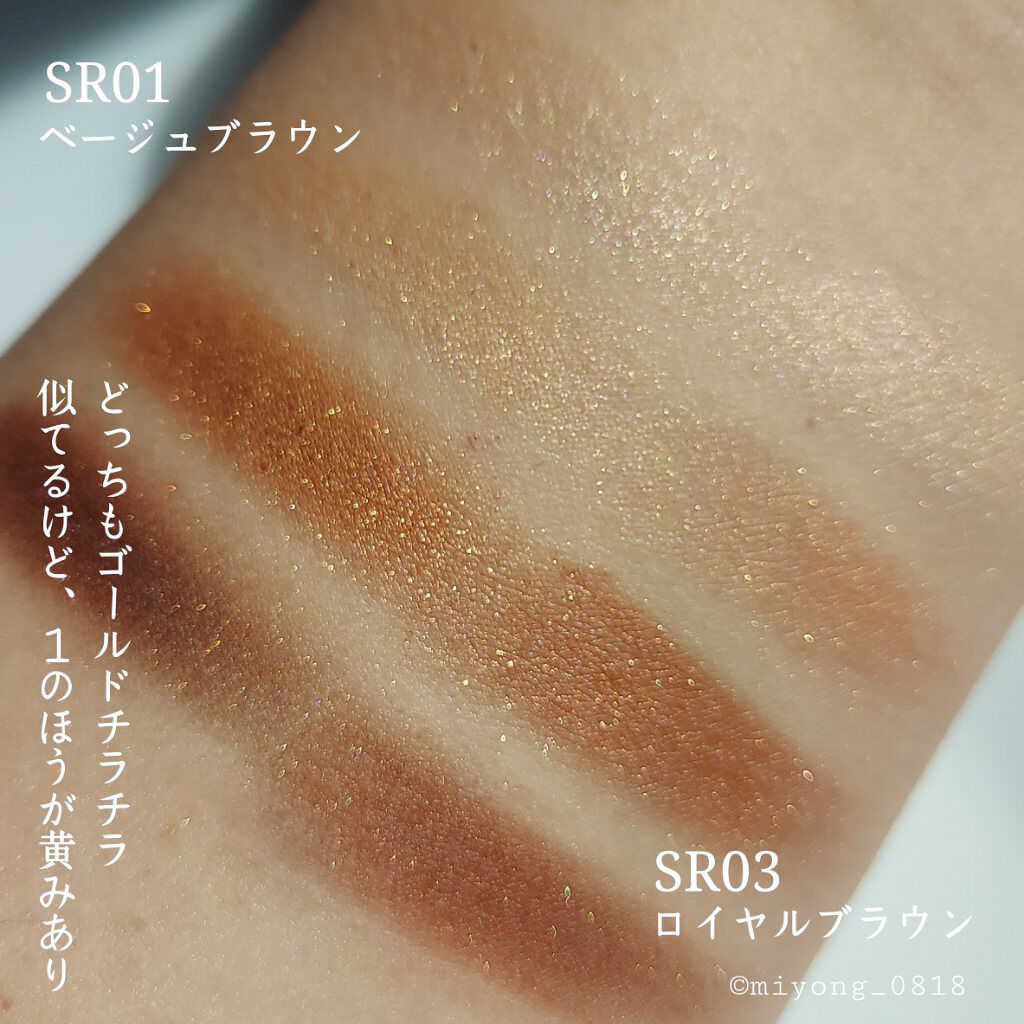 - <SR01 ベージュブラウン> トリエチルヘキサノイン、リンゴ酸ジイソステアリル、ラウリン酸亜鉛、イソステアリン酸水添ヒマシ油、ステアリン酸ソルビタン、スクワラン、ジメチコン、トコフェロール、メチルパラベン、(+/-)タルク、マイカ、金、酸化チタン、酸化鉄、水酸化Al、赤226 <SR02 リアルブラウン> トリエチルヘキサノイン、リンゴ酸ジイソステアリル、ラウリン酸亜鉛、イソステアリン酸水添ヒマシ油、ステアリン酸ソルビタン、スクワラン、ジメチコン、トコフェロール、メチルパラベン、(+/-)タルク、マイカ、金、酸化チタン、酸化鉄、水酸化Al、赤226 <SR03 ロイヤルブラウン> トリエチルヘキサノイン、リンゴ酸ジイソステアリル、ラウリン酸亜鉛、イソステアリン酸水添ヒマシ油、ステアリン酸ソルビタン、スクワラン、ジメチコン、トコフェロール、メチルパラベン、(+/-)タルク、マイカ、金、酸化チタン、酸化鉄、水酸化Al、赤226 <SR04 スモーキーブラウン> トリエチルヘキサノイン、リンゴ酸ジイソステアリル、ラウリン酸亜鉛、イソステアリン酸水添ヒマシ油、ステアリン酸ソルビタン、スクワラン、ジメチコン、トコフェロール、メチルパラベン、(+/-)タルク、マイカ、金、酸化チタン、酸化鉄、水酸化Al、赤226 <SR05 ウォームブラウン> トリエチルヘキサノイン、リンゴ酸ジイソステアリル、ラウリン酸亜鉛、イソステアリン酸水添ヒマシ油、ステアリン酸ソルビタン、スクワラン、ジメチコン、トコフェロール、メチルパラベン、(+/-)タルク、マイカ、金、酸化チタン、酸化鉄、水酸化Al、赤226 <SR06 センシュアルブラウン> トリエチルヘキサノイン、リンゴ酸ジイソステアリル、ラウリン酸亜鉛、イソステアリン酸水添ヒマシ油、ステアリン酸ソルビタン、スクワラン、ジメチコン、トコフェロール、メチルパラベン、(+/-)タルク、マイカ、金、酸化チタン、酸化鉄、水酸化Al、赤226 <SR07 マグノリアブラウン(限定)> トリエチルヘキサノイン、リンゴ酸ジイソステアリル、ラウリン酸亜鉛、イソステアリン酸水添ヒマシ油、ステアリン酸ソルビタン、スクワラン、ジメチコン、トコフェロール、メチルパラベン、(+/-)グンジョウ、コンジョウ、タルク、マイカ、金、酸化チタン、酸化鉄 <SR08 アクアティックブラウン> トリエチルヘキサノイン、リンゴ酸ジイソステアリル、ラウリン酸亜鉛、イソステアリン酸水添ヒマシ油、ステアリン酸ソルビタン、スクワラン、ジメチコン、トコフェロール、メチルパラベン、(+/-)グンジョウ、コンジョウ、タルク、マイカ、金、酸化チタン、酸化鉄 <SR09 ベビーブラウン> トリエチルヘキサノイン、リンゴ酸ジイソステアリル、ラウリン酸亜鉛、イソステアリン酸水添ヒマシ油、ステアリン酸ソルビタン、スクワラン、ジメチコン、トコフェロール、メチルパラベン、タルク、ホウケイ酸(Ca/Al)、マイカ、金、酸化チタン、酸化鉄、赤226 <SR10 ピオニーブラウン> トリエチルヘキサノイン、リンゴ酸ジイソステアリル、ラウリン酸亜鉛、イソステアリン酸水添ヒマシ油、ステアリン酸ソルビタン、スクワラン、ジメチコン、トコフェロール、メチルパラベン、グンジョウ、タルク、マイカ、金、酸化チタン、酸化鉄 <SR11 ブリックブラウン> トリエチルヘキサノイン、リンゴ酸ジイソステアリル、ラウリン酸亜鉛、イソステアリン酸水添ヒマシ油、ステアリン酸ソルビタン、スクワラン、ジメチコン、トコフェロール、メチルパラベン、タルク、マイカ、金、酸化チタン、酸化鉄、赤202、赤226 <SR12 デニッシュブラウン(限定)> トリエチルヘキサノイン、リンゴ酸ジイソステアリル、ラウリン酸亜鉛、イソステアリン酸水添ヒマシ油、ステアリン酸ソルビタン、スクワラン、ジメチコン、シリカ、トコフェロール、ホウケイ酸(Ca/Al)、酸化スズ、メチルパラベン、グンジョウ、タルク、マイカ、金、酸化チタン、酸化鉄、赤226 <SR01'23 ベージュブラウン(限定デザイン)> トリエチルヘキサノイン、リンゴ酸ジイソステアリル、ラウリン酸亜鉛、イソステアリン酸水添ヒマシ油、ステアリン酸ソルビタン、スクワラン、ジメチコン、トコフェロール、メチルパラベン、(+/-)タルク、マイカ、金、酸化チタン、酸化鉄、水酸化Al、赤226 <SR03'23 ロイヤルブラウン(限定デザイン)> トリエチルヘキサノイン、リンゴ酸ジイソステアリル、ラウリン酸亜鉛、イソステアリン酸水添ヒマシ油、ステアリン酸ソルビタン、スクワラン、ジメチコン、トコフェロール、メチルパラベン、(+/-)タルク、マイカ、金、酸化チタン、酸化鉄、水酸化Al、赤226 <SR11'23 ブリックブラウン(限定デザイン)> トリエチルヘキサノイン、リンゴ酸ジイソステアリル、ラウリン酸亜鉛、イソステアリン酸水添ヒマシ油、ステアリン酸ソルビタン、スクワラン、ジメチコン、トコフェロール、メチルパラベン、(+/-)タルク、マイカ、金、酸化チタン、酸化鉄、水酸化Al、赤226 <SR13 ヘーゼルブラウン(限定)> トリエチルヘキサノイン、リンゴ酸ジイソス