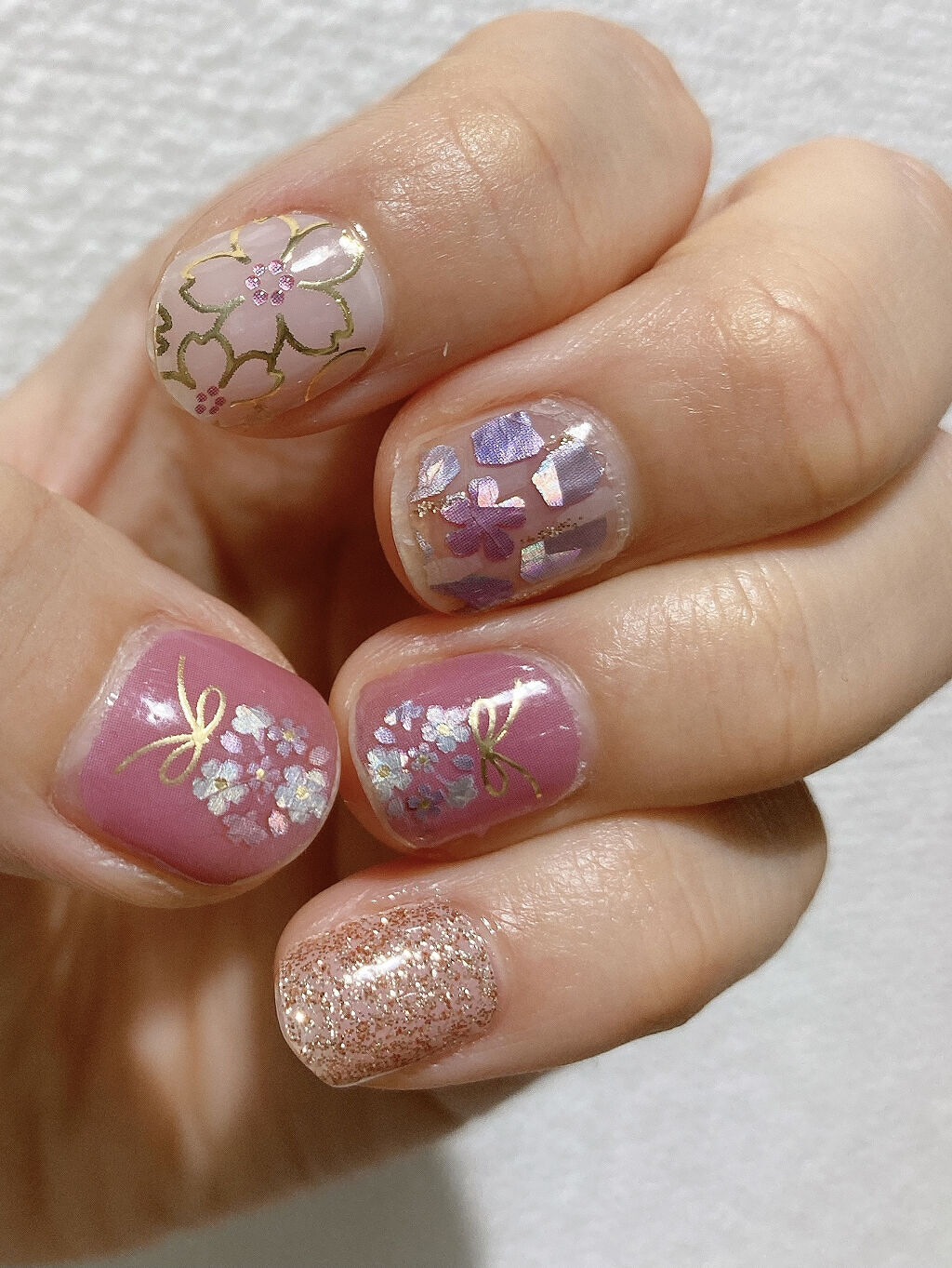 セリアの"貼るジェルネイルシール"〜和柄コレクション〜和柄と落ち着いた色合いが可愛い🌸ツヤツヤキラキラ✨開けるとネイルのような香りがします。不器用なのでガタガタですが簡単に貼ることができました♪可愛くて個人的には満足です♡商品の良さを半減させ...