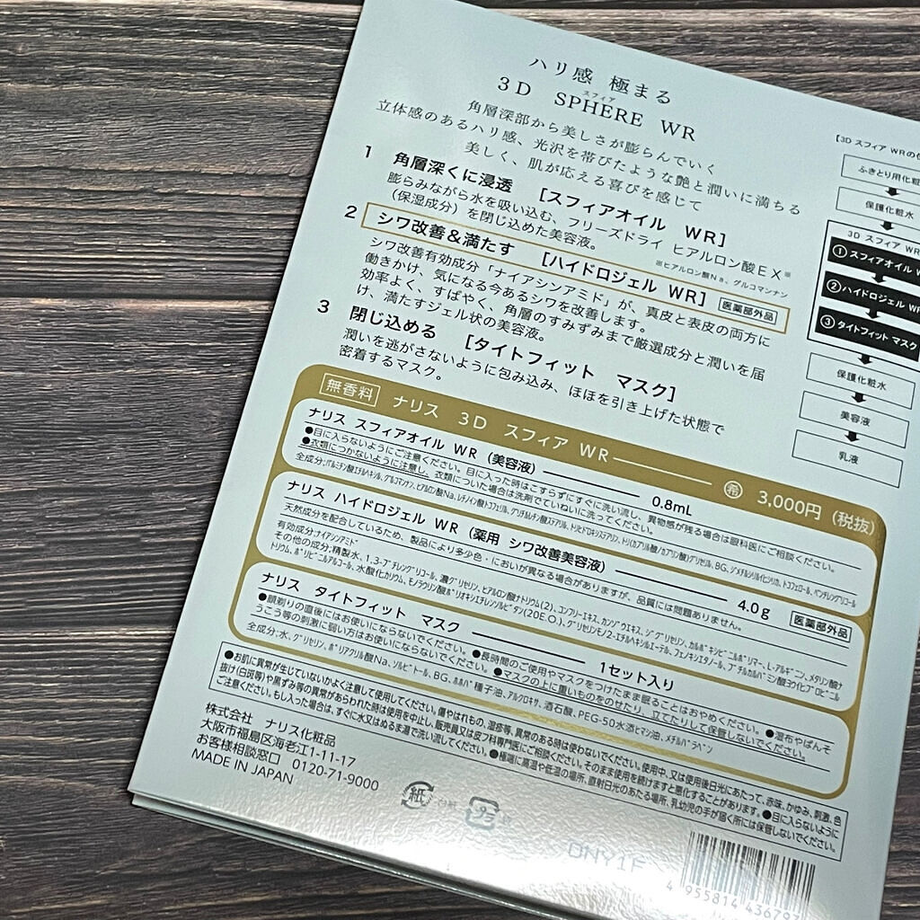 【3DスフィアWR】●セット内容●・スフィアオイルWR0.8ml・ハイドロジェルWR(医薬部外品)4g・タイトフィットマスク1セット3DスフィアWR提供して頂きました♪エステティック技術と化粧品研究の融合が生み出す美のチカラ。とのこと。①角層...