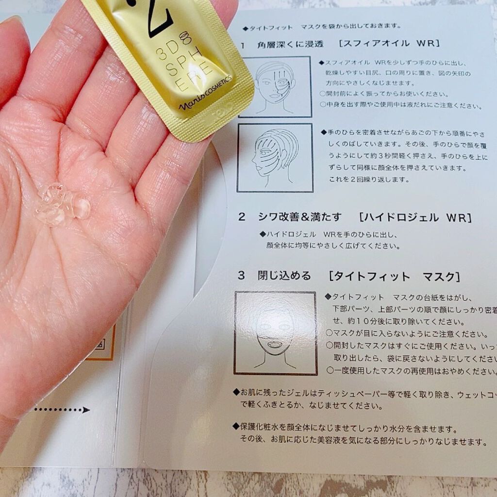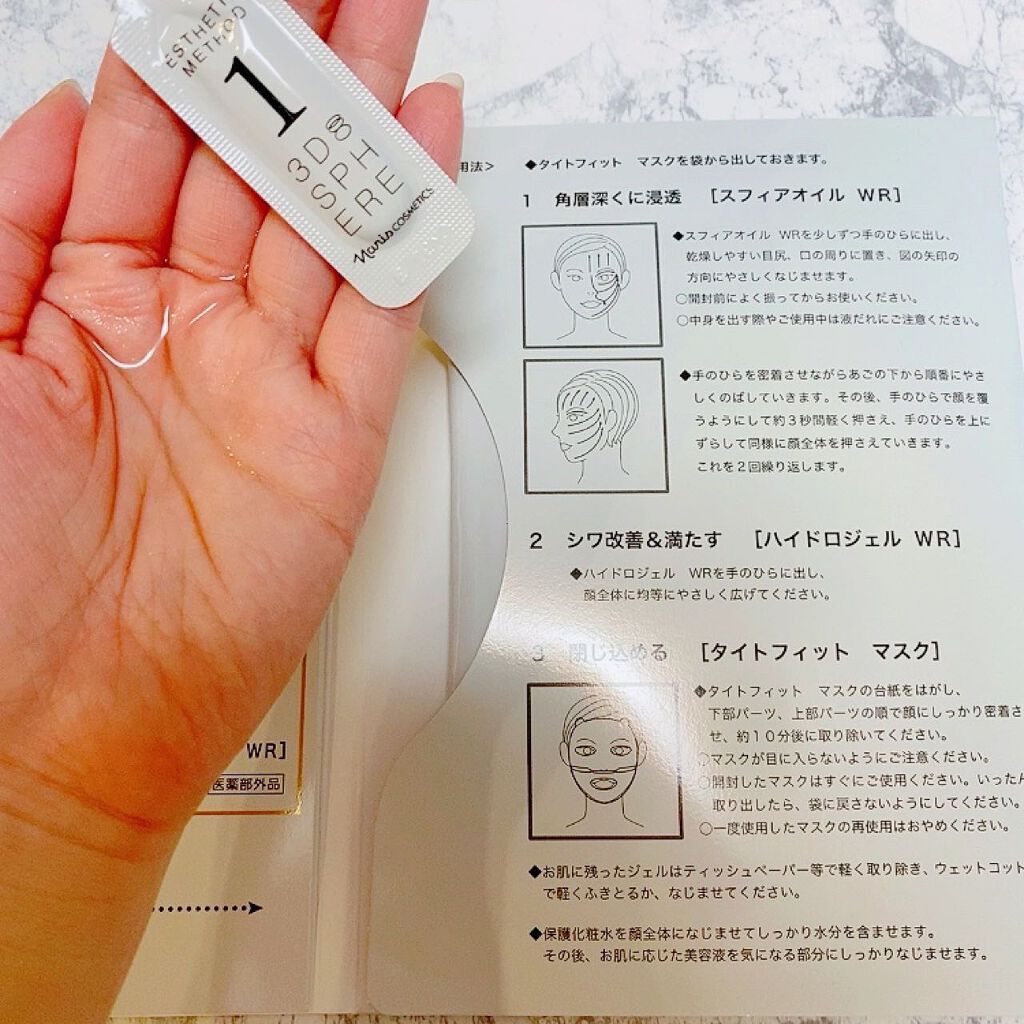 【3DスフィアWR】●セット内容●・スフィアオイルWR0.8ml・ハイドロジェルWR(医薬部外品)4g・タイトフィットマスク1セット3DスフィアWR提供して頂きました♪エステティック技術と化粧品研究の融合が生み出す美のチカラ。とのこと。①角層...