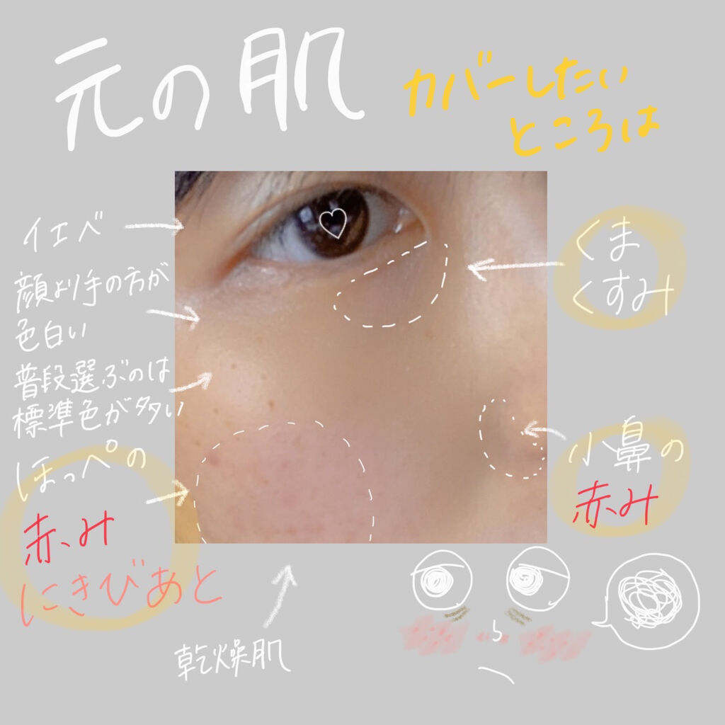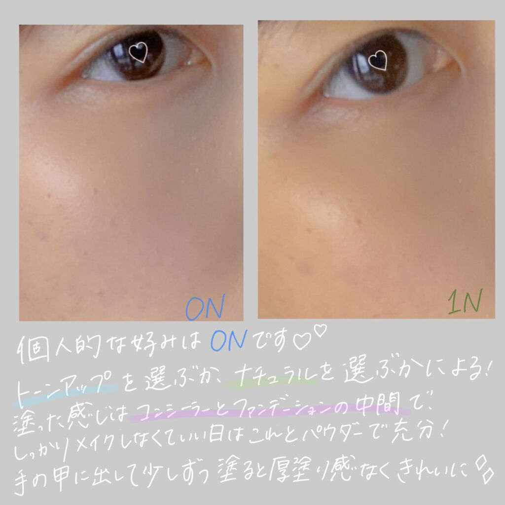 スキンケア効果があり、保湿される 長時間肌に密着する 色の展開が多い 1Nの方が地肌と近く、素肌感が出しやすい! 黄味が強めのため、カバー力も1Nの方があり 0Nは自然にトーンアップする感じ 色味が明るくても、赤みやくすみはちゃんとカバーしてくれた! 伸びがいい分肌なじみも良い! 本当に乾燥しなくて、しかもよれてなくて、はげてなくて感動した 下地とこれとパウダーだけで充分ベースメイク完成できる♡ 時短できるのも嬉しいポイント💡