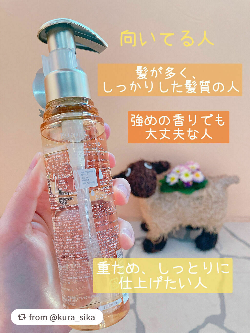 .普段のヘアケアでヘアオイルは使用されていますか❔ヘアオイルには、摩擦や乾燥、ドライヤーなどの熱ダメージから髪を守る効果があります💡またツヤを与えて、まとまりやすい髪に整えてくれます💇🏻♀️Purunt.では4種類のヘアオイルを展開中🧴...