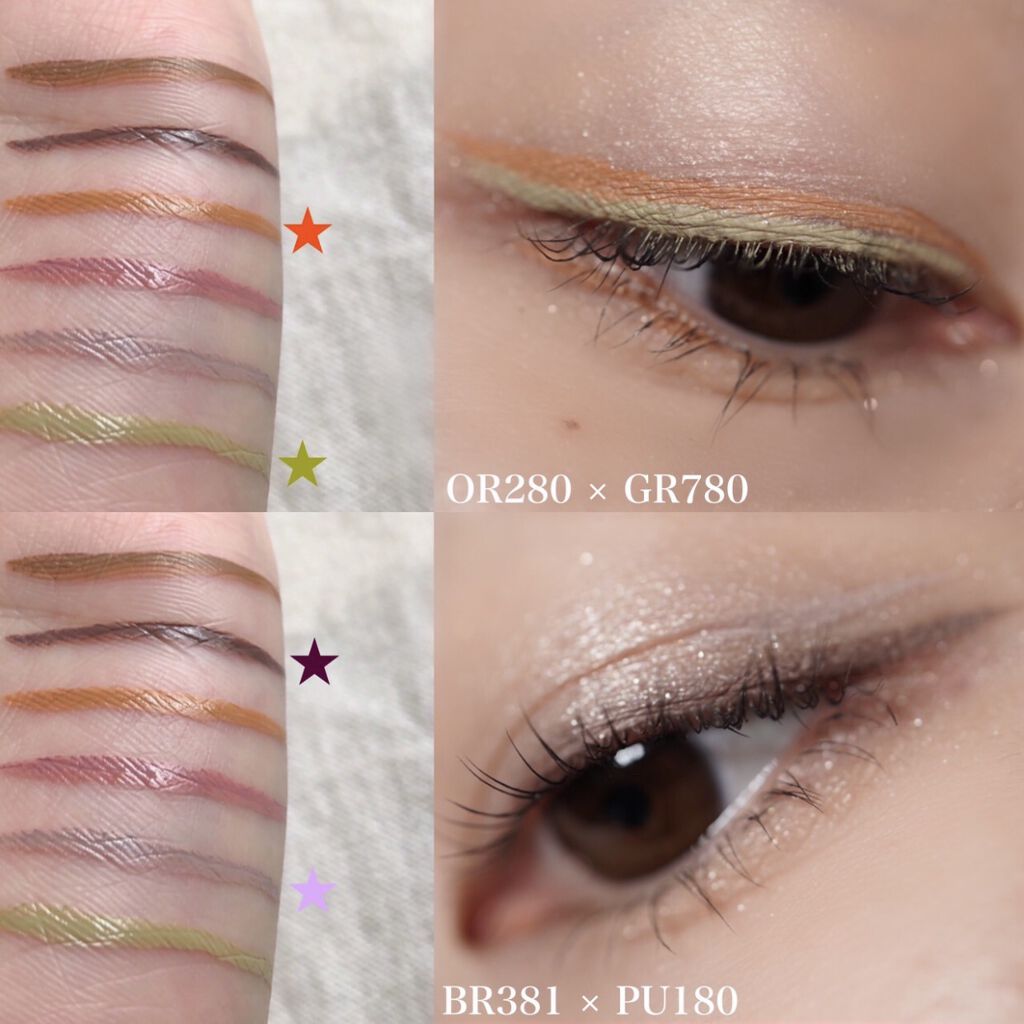 よくパレットのなかで明るいカラーをベースにまぶたに広く塗ることが多いのですが、パール感のあるカラーを避ける🙆♀️! パール感たっぷりの明るいカラーは涙袋に使うぐらい光を集めてぷっくり見せてくれるので、まぶたに広く使うと腫れぼったく見えがち😓 目元を明るくみせてくれたり、次に使うアイシャドウをぼかしやすくしてくれるけど、すっ飛ばしてメインのカラーを塗っちゃう✊🏻❤️🔥 涙袋にはたっぷり塗ってぷっくり見せる🙆♀️💕 シルキースフレアイズのマットタイプはすごく優れているな〜と感じました☺️💗 赤やオレンジなどは、入れすぎると腫れぼったく見えやすいので、見せたいカラーは下まぶた目尻にのせて色をたのしむ♡♡ パール感なしの透けマットだけじゃ物足りない… そう感じさせない華やかなラメが左上に入っているので黒目上と涙袋にのせるとすごく可愛い仕上がりに😍! 厄介な左右差のお陰でマットアイシャドウが好きになりました😌💕