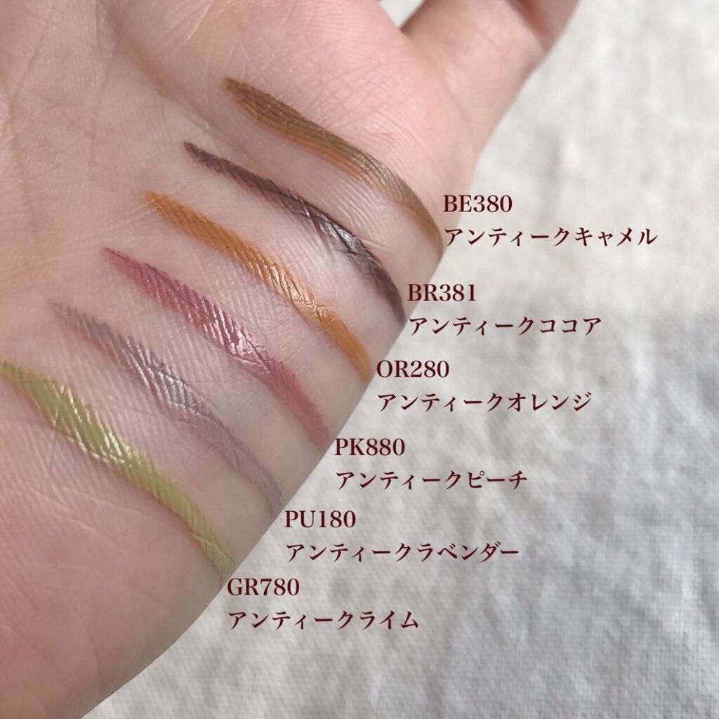 - <BE380 アンティークキャメル> 水・アクリレーツコポリマー・BG・エタノール・ポリアスパラギン酸Na・水溶性コラーゲン・EDTA-2Na・PVP・(チタン/酸化チタン)焼結物・クエン酸・クエン酸Na・ベヘネス-30・メタリン酸Na・水酸化Al・デヒドロ酢酸Na・フェノキシエタノール・メチルパラベン・酸化チタン・酸化鉄 <BR381 アンティークココア> 水・(スチレン/アクリレーツ)コポリマーアンモニウム・BG・エタノール・(チタン/酸化チタン)焼結物・ポリアスパラギン酸Na・水溶性コラーゲン・EDTA-2Na・PVP・クエン酸・クエン酸Na・スルホコハク酸ジエチルヘキシルNa・ベヘネス-30・メタリン酸Na・水酸化Al・デヒドロ酢酸Na・フェノキシエタノール・メチルパラベン・酸化チタン・酸化鉄 <GR780 アンティークライム> 水・(スチレン/アクリレーツ)コポリマーアンモニウム・BG・エタノール・ポリアスパラギン酸Na・水溶性コラーゲン・EDTA-2Na・PVP・(チタン/酸化チタン)焼結物・クエン酸・クエン酸Na・スルホコハク酸ジエチルヘキシルNa・ベヘネス-30・メタリン酸Na・水酸化Al・デヒドロ酢酸Na・フェノキシエタノール・メチルパラベン・酸化チタン・酸化鉄 <OR280 アンティークオレンジ> 水・アクリレーツコポリマー・BG・エタノール・ポリアスパラギン酸Na・水溶性コラーゲン・EDTA-2Na・PVP・(チタン/酸化チタン)焼結物・クエン酸・クエン酸Na・ベヘネス-30・メタリン酸Na・水酸化Al・デヒドロ酢酸Na・フェノキシエタノール・メチルパラベン・酸化チタン・酸化鉄 <PK880 アンティークピーチ> 水・(スチレン/アクリレーツ)コポリマーアンモニウム・BG・エタノール・ベヘネス-30・ポリアスパラギン酸Na・水溶性コラーゲン・EDTA-2Na・(チタン/酸化チタン)焼結物・キサンタンガム・クエン酸・クエン酸Na・スルホコハク酸ジエチルヘキシルNa・水酸化Al・デヒドロ酢酸Na・フェノキシエタノール・メチルパラベン・酸化チタン・酸化鉄・硫酸Ba・赤226 <PU180 アンティークラベンダー> 水・(スチレン/アクリレーツ)コポリマーアンモニウム・BG・エタノール・ベヘネス-30・ポリアスパラギン酸Na・水溶性コラーゲン・EDTA-2Na・(チタン/酸化チタン)焼結物・キサンタンガム・クエン酸・クエン酸Na・スルホコハク酸ジエチルヘキシルNa・水酸化Al・デヒドロ酢酸Na・フェノキシエタノール・メチルパラベン・酸化チタン・酸化鉄・硫酸Ba・赤226