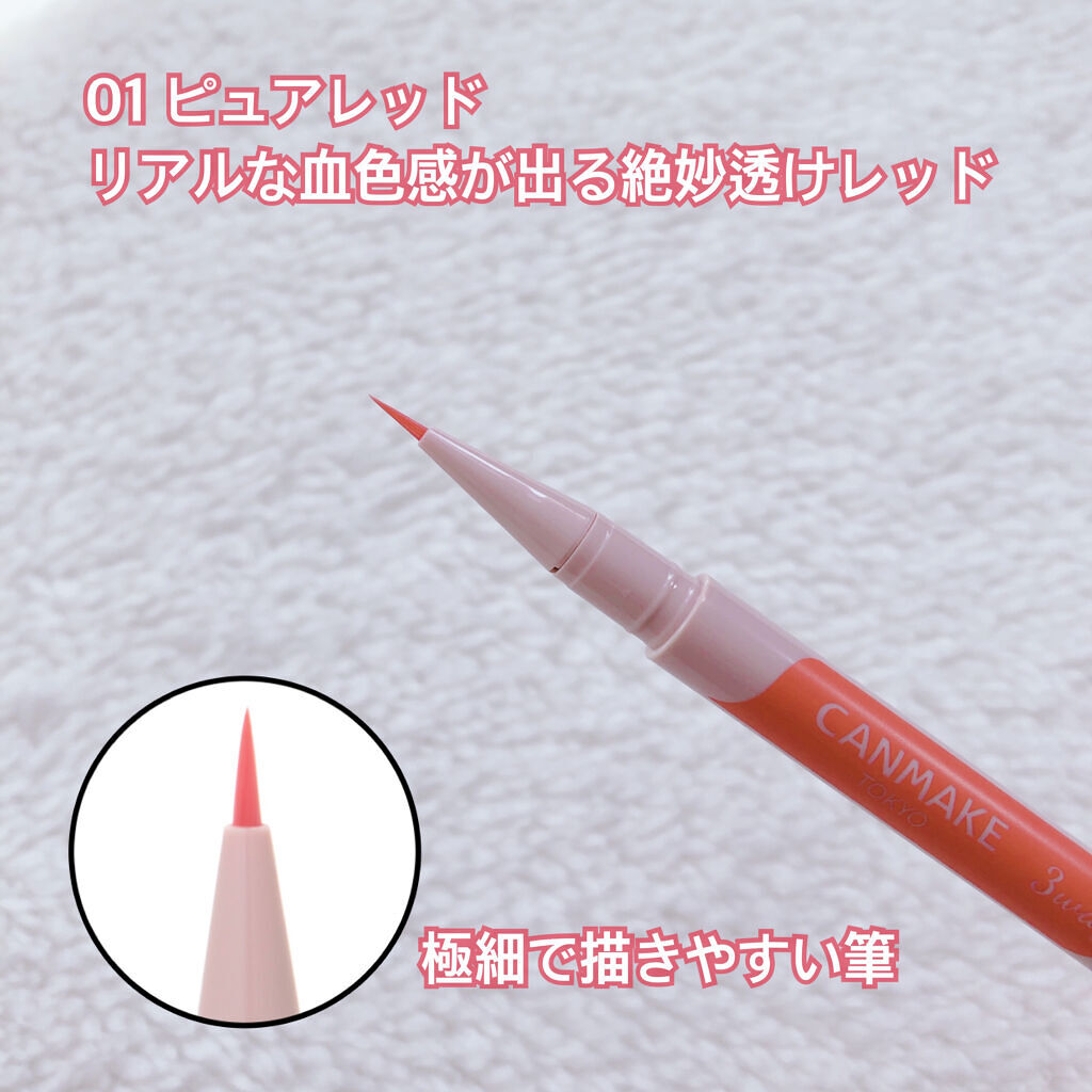 - ふたえ強調・涙袋の影・アイプランパー効果(※)に使える 激細筆の目元用透けルージュライナー 自然でリアルな血色を叶える、絶妙な透け発色ライナー♥ まるで目元にルージュを塗ったかのように血色感を与え、かわいい印象に仕上がります。 描いた線が太くならないよう、筆を根元から細くして 描きやすい距離と適度なコシになるように、短い筆に仕上げました。 汗・皮脂・こすれに強く、朝描いたラインも長時間キープされます。 (※メイクアップ効果による)