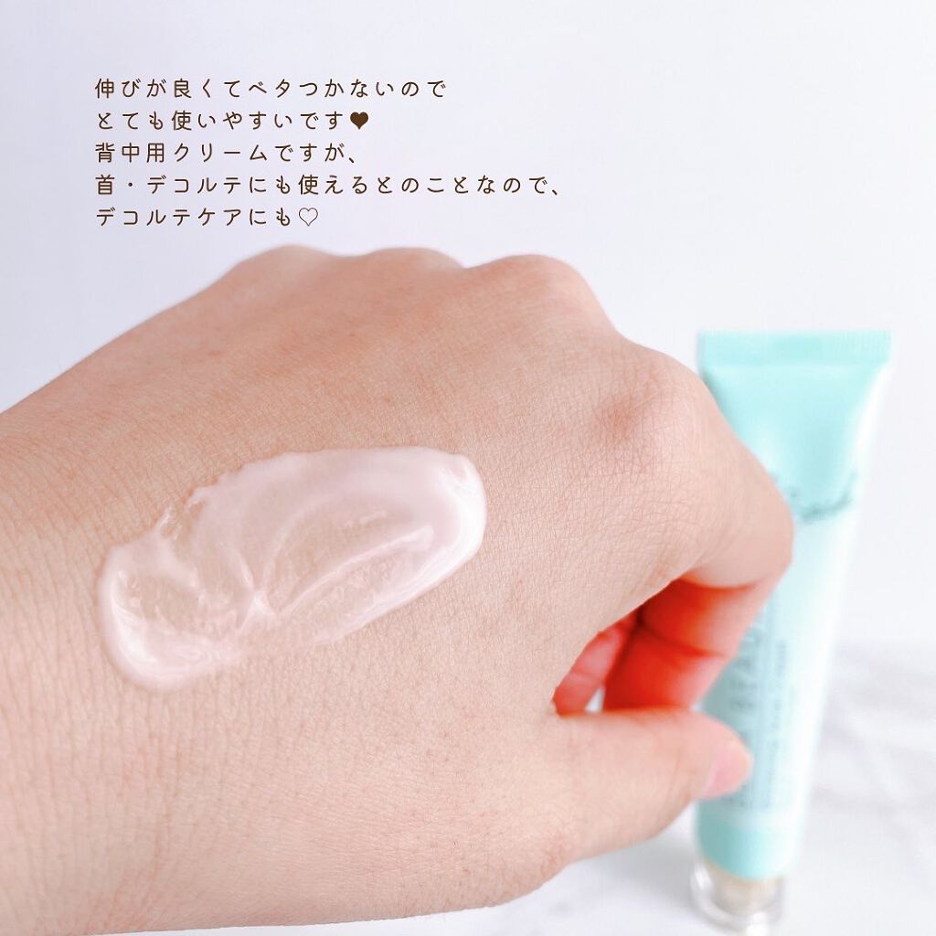 背中用クリームです。ニキビ・肌荒れ・美白ケアに最適可愛らしいお空色のパッケージがいいですね。持ち歩きにも便利なコンパクトなサイズ。有効成分グリチルリチン酸ジカリウムとアルブチンを始めとし、CICA成分も配合しているそうでうです。しっとりしてい...