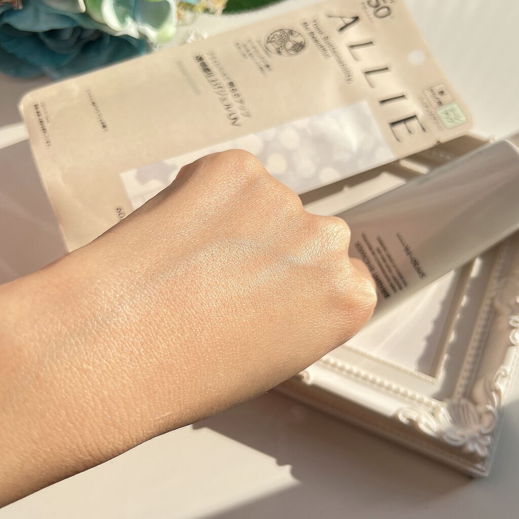\お肌焼きたくない/べたべたしたくもない!!うるおいを保持してとにかくベタつきずらいALLIEクロノビューティトーンアップUV01ブライトシャワー税込2,332円ジェルだからべたつきずらくて全身に心地よく密着してくれる高輝度パールでデコルテ・...