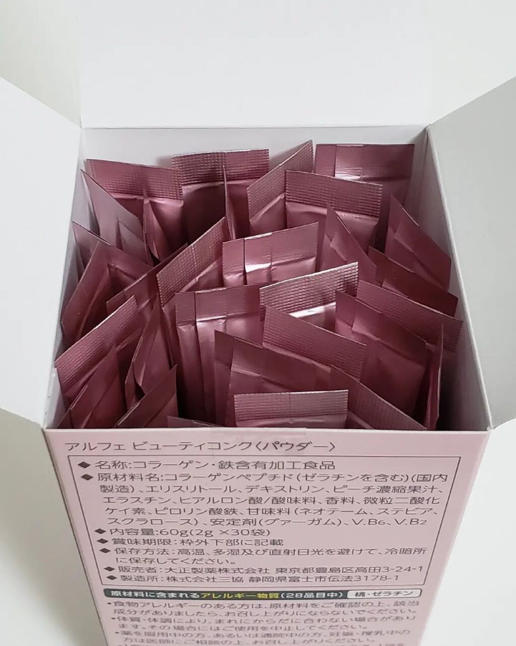 お味はピーチ。パウダーですがこれは本当飲みやすい!水なしでそのまま飲んでも美味しいしクセなし✨ 鉄分入りなのも嬉しいポイント 配合量は2mmですが生理中や貧血気味の方にも手軽に摂れるので女性には助かりますね♡ 30袋入りを購入しましたが個梱包になってるのもありがたいです。疲れた時は一日2個を飲むようにしてます。飲み続けると肌荒れしにくくなります✨