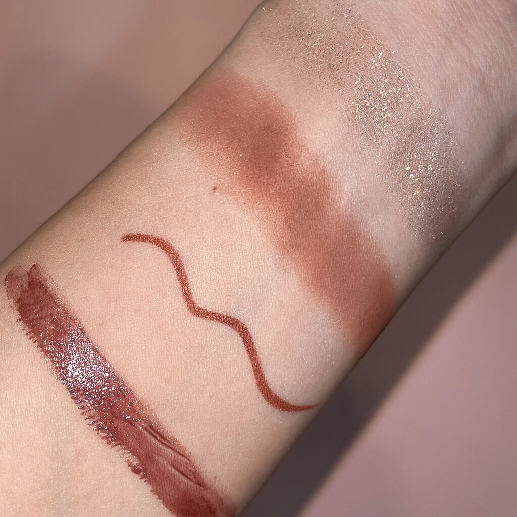 全体的に淡めです! イエベ向きな黄色みのあるブラウン系🤎 シマーなラメが可愛すぎる!! 密着度の高いラメでポンと乗せるだけで キラッキラ✨✨ 粉飛びもしないです! 発色はいいですが淡いので 初心者さんでも使いやすい!!!