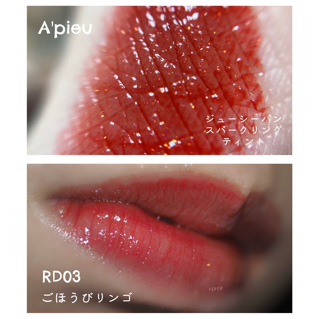 ❤️A'pieuジューシーパンスパークリングティントRD01 いちころライチ❤️見たままの発色でディープなブラウンレッドです🍎✨ジュエリーパウダー配合でキラキラとしたラメ感と綺麗なツヤ感が楽しめます😊💓唇に塗ると落ちにくいですが、クレンジング...