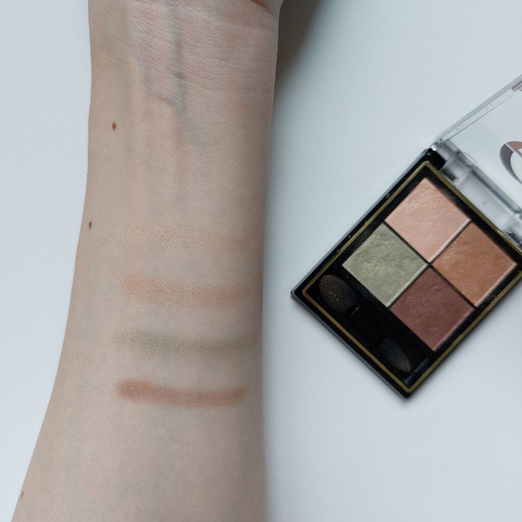 - 1.重ねてもくすまないクリアな発色。ナチュラルに溶け合う絶妙4カラー。 ツヤタイプ(左上・左下カラー):アイホール全体にぼかしたり、目尻へのポイント使いも。 ラメタイプ(右上カラー):アイホール中心や下まぶたにきらめきのアクセント。 マットタイプ(右下カラー):単色で陰影を付けたり、ツヤタイプと重ねてニュアンスをプラス。 2.うっとりするほどリッチな質感で粉飛びしないのに、軽いタッチで伸びて重ねやすいテクスチャー。 3.スクワラン(保湿)配合で目元の乾燥を防ぎます。 [PERFORMANCE] 色と質感の重ね着を楽しむ、ファッション感覚アイシャドウパレット [DESIGN] ・まぶたにひっかからない、なめらかな上質チップ ・薄型コンパクトだからポーチの中でかさばらない [QUALITY] 1.重ねてもくすまないクリアな発色 ナチュラルに溶け合う絶妙4カラー 2.パールの重ね技でまぶたに極上のツヤ感 微細多色 カラーパール 銀コーティング ガラスパール* excel GOLD-MIX処方(金パール配合)* (*右上のシャイニーカラーのみ) 3.うっとりするほどリッチな質感で粉飛び知らず!なのに、軽いタッチで伸びて重ねやすい 4.スクワラン(保湿)配合で目元の乾燥を防ぐ