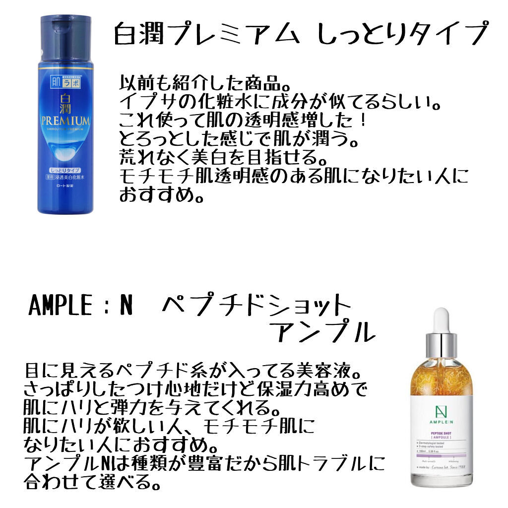 以前も紹介した洗顔。朝は水洗顔で、夜はこれを使っています。 肌荒れニキビに悩んでる人におすすめ 使い始めて感動。ニキビが格段にできなくなり使っていくうちにニキビ跡も薄く小さくなってる🥺 肌荒れニキビに悩んでる人、即効性を求めてる人におすすめ さっぱりしてるからベタベタするのが苦手な人、初めて化粧水買う人におすすめ 個人的に毎日使うより週に2〜3回くらい使う方が効果が感じられる気がする🤔 肌の調子を整えたい人、初めてパック買う人におすすめ 使い始めて肌に透明感が増したのが目に見えてわかる😳 透明感のある肌になりたい人におすすめ 私は保湿はしたいけどベタベタするのは苦手ですがこれは割とさっぱりしてるつけ心地なのにしっかりと保湿される! 美容液欲しいけど何買っていいかわからない人に一度使ってみてほしいです!