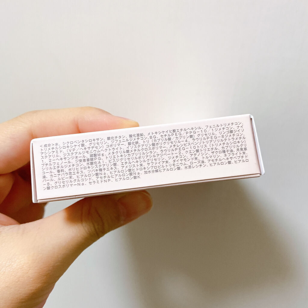 - <01 ナチュラルカラー> 水、シクロペンタシロキサン、酸化チタン、酸化亜鉛、メトキシケイヒ酸エチルヘキシル、フェニルトリメチコン、トリメチルシロキシケイ酸、グリセリン、ジフェニルジメチコン、BG、セチルPEG/PPG-10/1ジメチコン、ナイアシンアミド、(VP/ヘキサデセン)コポリマー、酸化鉄、トリ(カプリル酸/カプリン酸)グリセリル、リンゴ酸ジイソステアリル、ジステアルジモニウムヘクトライト、イソステアリン酸ポリグリセリル-4、ラウリルPEG-8ジメチコン、1,2-ヘキサンジオール、硫酸Mg、メタクリル酸メチルクロスポリマー、メチレンビスベンゾトリアゾリルテトラメチルブチルフェノール、ジ安息香酸PG、トリエトキシカプリリルシラン、ラウリルPEG-10トリス(トリメチルシロキシ)シリルエチルジメチコン、水酸化Al、ビスジグリセリルポリアシルアジペート-2、クエン酸トリエチル、カプリリルグリコール、香料、ポリヒドロキシステアリン酸、エチルヘキシルグリセリン、ジメチコン、アデノシン、ザクロ種子油、月見草油、カニナバラ花エキス、ツバキ種子エキス、アメジスト末、サファイア末、ダイヤモンド末、トルマリン、ネフライト末、パール、ルビー末、ヒアルロン酸Na、ヒアルロン酸ヒドロキシプロピルトリモニウム、ローズ油、アセチルヘキサペプチド-8、グリセリルグルコシド、アセチルヒアルロン酸Na、加水分解ヒアルロン酸、水添レシチン、ヒアルロン酸、ヒアルロン酸クロスポリマーNa、セラミドNP、ヒアルロン酸K <02 ヘルシーカラー> 水、シクロペンタシロキサン、酸化チタン、酸化亜鉛、メトキシケイヒ酸エチルヘキシル、フェニルトリメチコン、トリメチルシロキシケイ酸、グリセリン、ジフェニルジメチコン、酸化鉄、BG、ナイアシンアミド、セチルPEG/PPG-10/1ジメチコン、(VP/ヘキサデセン)コポリマー、トリ(カプリル酸/カプリン酸)グリセリル、リンゴ酸ジイソステアリル、ジステアルジモニウムヘクトライト、イソステアリン酸ポリグリセリル-4、ラウリルPEG-8ジメチコン、1,2-ヘキサンジオール、硫酸Mg、メチレンビスベンゾトリアゾリルテトラメチルブチルフェノール、ジ安息香酸PG、トリエトキシカプリリルシラン、ラウリルPEG-10トリス(トリメチルシロキシ)シリルエチルジメチコン、メタクリル酸メチルクロスポリマー、水酸化Al、ビスジグリセリルポリアシルアジペート-2、クエン酸トリエチル、カプリリルグリコール、香料、ポリヒドロキシステアリン酸、エチルヘキシルグリセリン、ジメチコン、アデノシン、ザクロ種子油、月見草油、カニナバラ花エキス、ツバキ種子エキス、トルマリン、サファイア末、ルビー末、パール、ネフライト末、ダイヤモンド末、アメジスト末、ヒアルロン酸Na、ローズ油、ヒアルロン酸ヒドロキシプロピルトリモニウム、グリセリルグルコシド、アセチルヘキサペプチド-8、アセチルヒアルロン酸Na、加水分解ヒアルロン酸、水添レシチン、ヒアルロン酸、ヒアルロン酸クロスポリマーNa、ヒアルロン酸K、セラミドNP