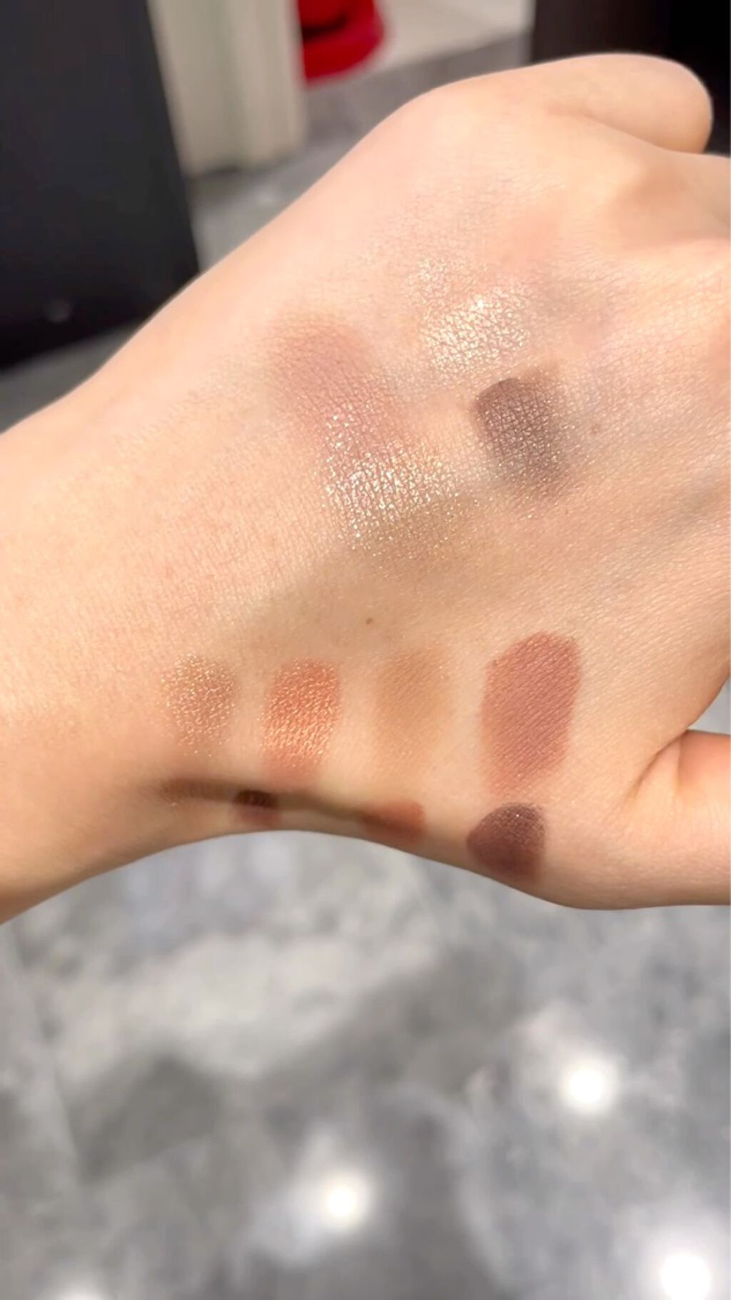 全て淡い発色で締め色なしなのに 印影を出してくれつつ、瞼は澄んだ印象に。 コンスピキュアズはラメの高級感が有名だけれど 個人的にはマットの透け感が好きです。 二重幅に湿式シャドウが溜まるのを防ぐ為には 付属のブラシで薄く撫でると◎ 繊細ラメ際立ちには上、左下、右下 印影メイクには上、右下、左下 の順番塗りを。 眉もピンクに染めて、 柔らかな目元を引き締めます。