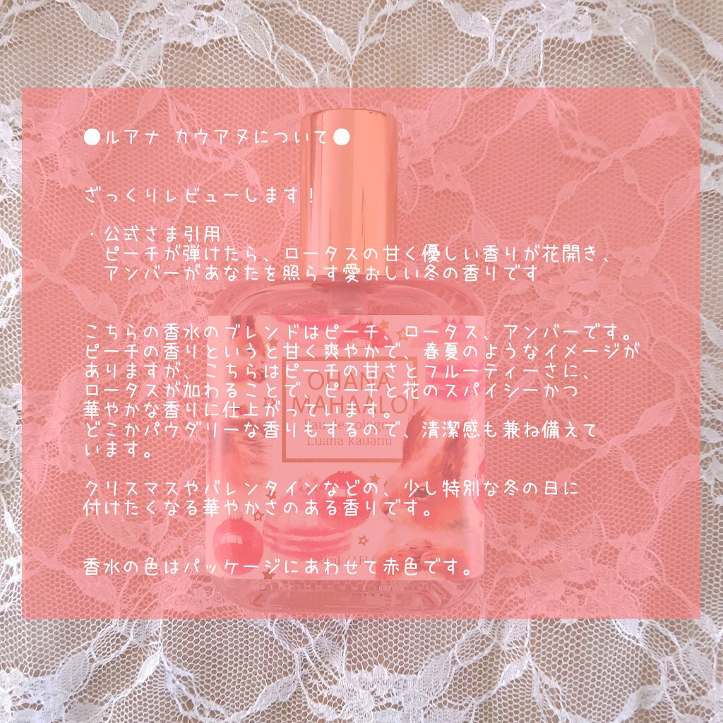- 大切なあなたへ、可愛いパッケージと、持ち運びやすい小さなサイズのオーデコロン。 <香りについて> Luanaは「一緒に楽しむ」,kauanuは「冬」という意味。リスの子供たちがパーティーの飾りつけ、きらめく部屋の中で楽し気に笑うイメージ。ピーチが弾けたら、ロータスの甘く優しい香りが花開き、アンバーが明るくあなたを照らす愛しい冬の香りです。