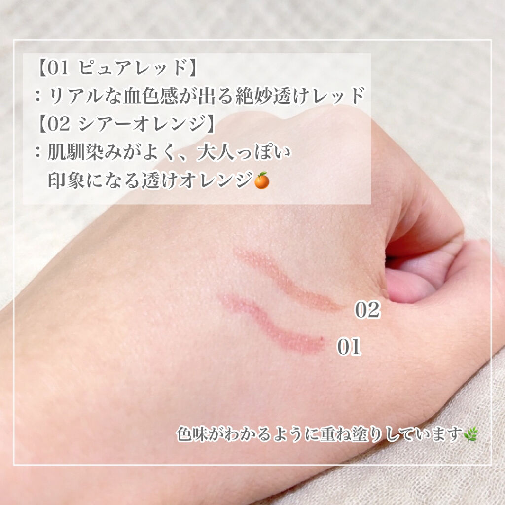 - <01 ピュアレッド> 水、BG、アクリレーツコポリマー、DPG、フェノキシエタノール、メチルパラベン、デヒドロ酢酸Na、エチルパラベン、アスコルビン酸、リンゴ酸、エチルヘキシルグリセリン、カミツレ花エキス、サトザクラ花エキス、チャ葉エキス、赤227、黄4 <02 シアーオレンジ> 水、BG、アクリレーツコポリマー、DPG、フェノキシエタノール、メチルパラベン、デヒドロ酢酸Na、エチルパラベン、アスコルビン酸、リンゴ酸、エチルヘキシルグリセリン、カミツレ花エキス、サトザクラ花エキス、チャ葉エキス、黄4、赤227、青1 <03 アイシーピンク> 水、BG、アクリレーツコポリマー、DPG、フェノキシエタノール、メチルパラベン、デヒドロ酢酸Na、エチルパラベン、カミツレ花エキス、サトザクラ花エキス、アスコルビン酸、リンゴ酸、チャ葉エキス、エチルヘキシルグリセリン、赤227