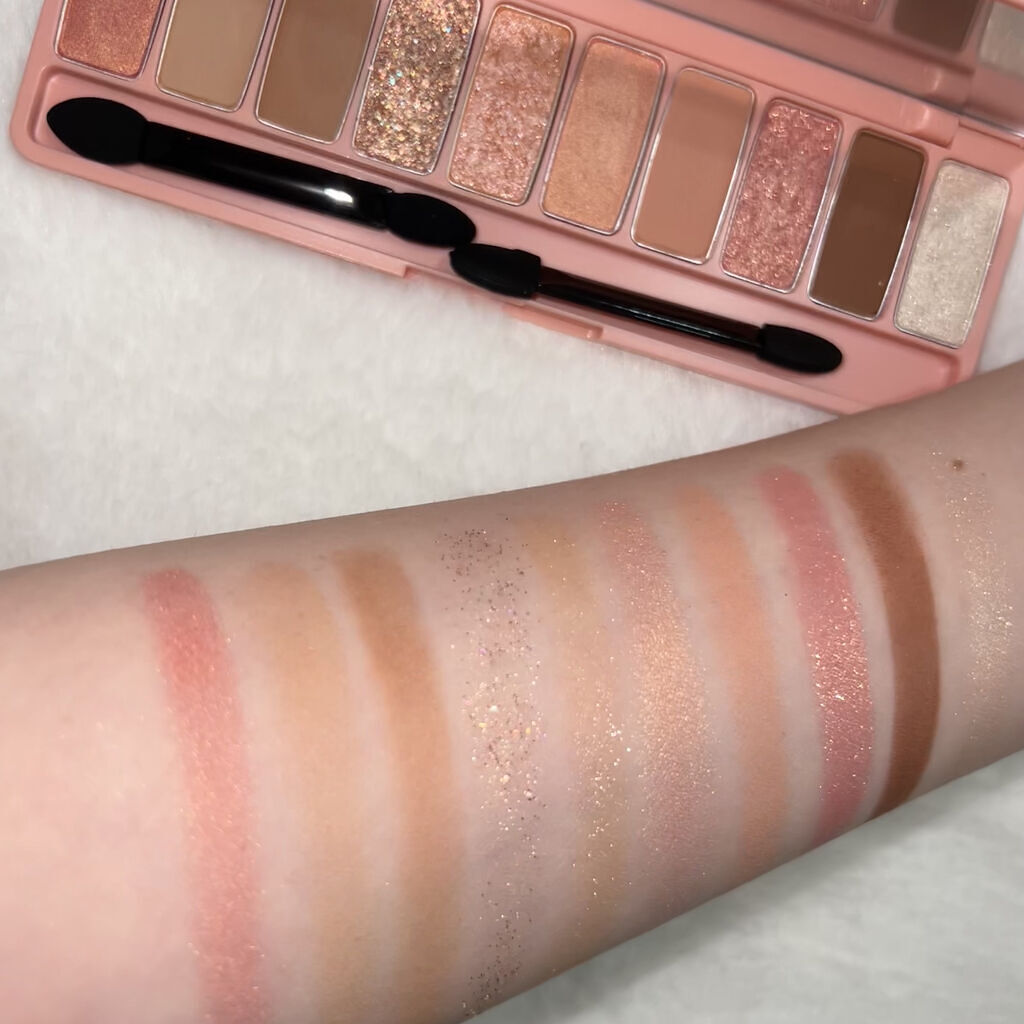 - 肌なじみの良い、鮮やかな発色で目元を華やかに彩る捨て色なしの10色アイシャドウパレット 異なる3種のテクスチャーを自由に組み合わせて、グラデーションも思いのままに。 NEW 2023.4 ・肌トーンにあう配色を詰め込んだトレンドカラー 肌トーンに合わせて、自分に似合うトレンドカラーが楽しめる♡ パーソナルカラー×トレンドカラーの掛け合わせパレットで、デイリーメイクもスペシャルメイクも気分にあわせてなりたい自分に! ・むにゅっとジェル質感ラメで高密着、煌めく目元 パレットの中でもポイントとなる大きめ粒子のラメは、ジェルのような新質感で落ちにくく肌にぴったりと密着します。キラキラとした目元をキープします。 ・使うカラーは大きめに!リアル捨て色なしパレット ベースやラメのよく使うカラーと締め色や濃い色等の減りが少ないカラーを異なるサイズで詰め込んだ、リアル捨て色なしパレット! <使用方法> 付属のデュアルシャドウブラシでベースカラーをまぶた全体に塗り広げます。細いブラシでグラデーションや目尻、アイライン、涙袋などのポイントカラーをのせて仕上げます。