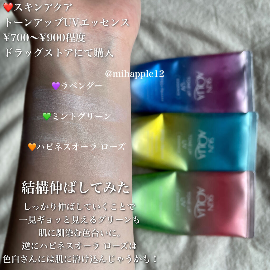 【🌞今から紫外線対策🌞】大人気トーンアップベース、三種比較!❤️スキンアクアトーンアップUVエッセンスa・ラベンダー・ミントグリーン・ハピネスオーラローズ(限定)¥700~¥800前後【結論】ぶっちゃけトーンアップ効果は大差ないので①パッケー...