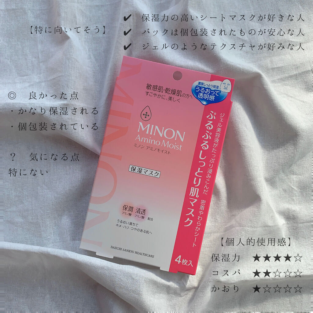 - 思わず触れたくなるほどみずみずしい肌へ。うるおって透明感。 乾燥による小ジワを目立たなくします(効能評価試験済み) 水分を保つ機能が低下しがちな角質層に、バリア機能をサポートする保湿成分を補給 ぷるぷるジェルがしみこんだ密着やわらかシートで、液ダレしません ◎ミノン アミノモイストのシートマスクは化粧水で肌を整えた後にお使いいただく「美容液マスク」です。 週に1-2回のスペシャルケアとしておすすめです♪