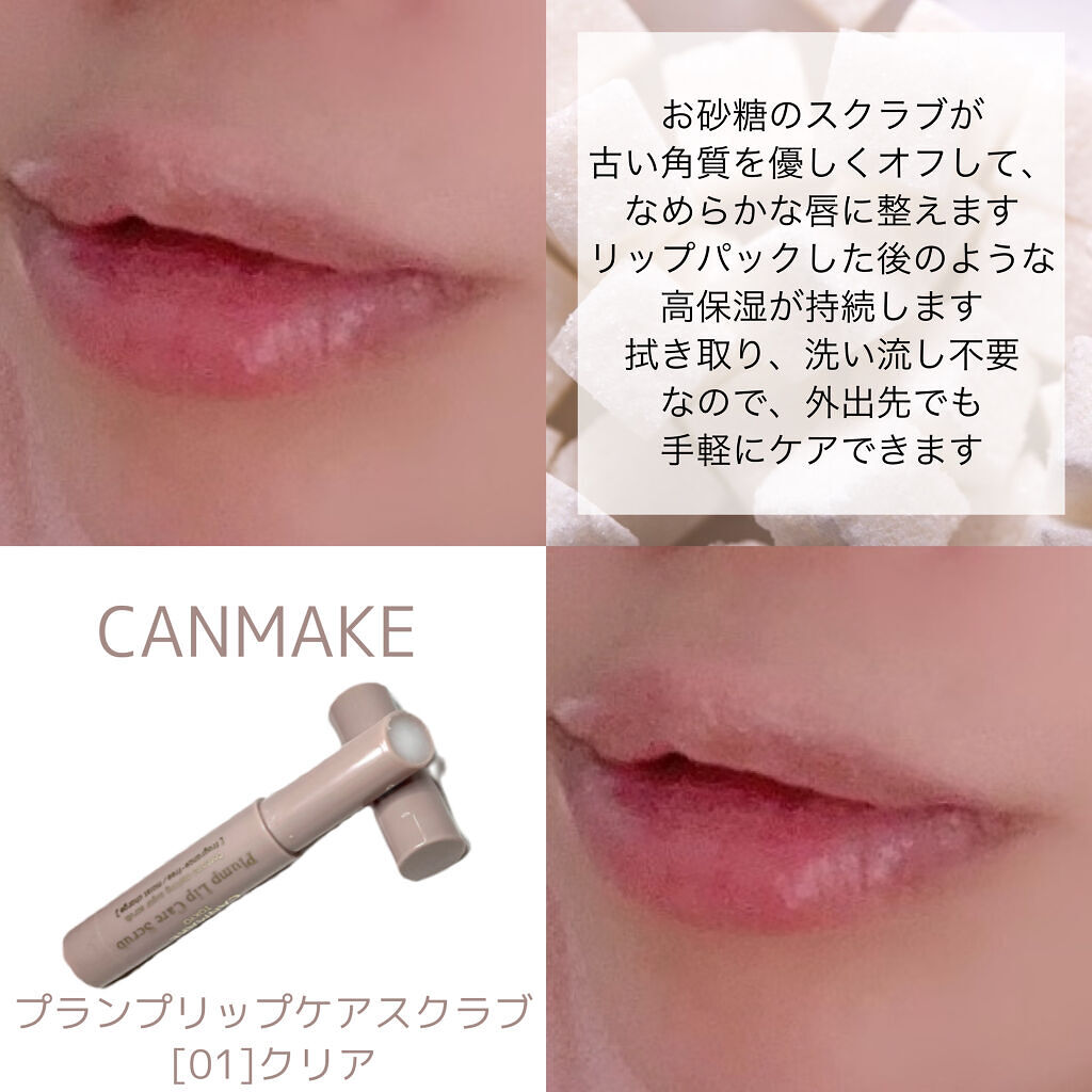 〈CANMAKE〉·プランプリップケアスクラブ(01クリア)発売以来ずっとリピートしている愛用品!スクラブ入りのリップクリームで、スクラブのザラザラ感もほどよくすぐに馴染み、凄く使いやすいです。ふき取りも不要でそのまま保湿もできるので、ケアと...