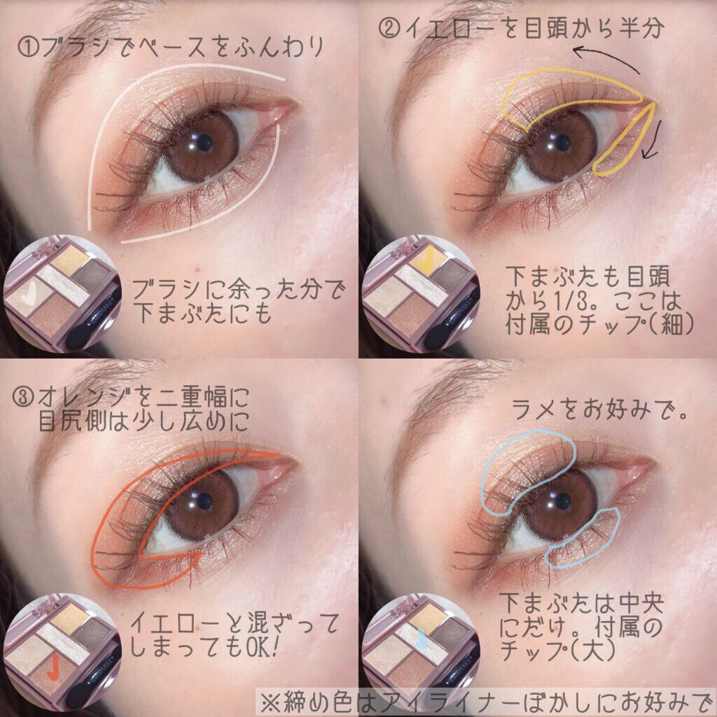 よくパレットのなかで明るいカラーをベースにまぶたに広く塗ることが多いのですが、パール感のあるカラーを避ける🙆♀️! パール感たっぷりの明るいカラーは涙袋に使うぐらい光を集めてぷっくり見せてくれるので、まぶたに広く使うと腫れぼったく見えがち😓 目元を明るくみせてくれたり、次に使うアイシャドウをぼかしやすくしてくれるけど、すっ飛ばしてメインのカラーを塗っちゃう✊🏻❤️🔥 涙袋にはたっぷり塗ってぷっくり見せる🙆♀️💕 シルキースフレアイズのマットタイプはすごく優れているな〜と感じました☺️💗 赤やオレンジなどは、入れすぎると腫れぼったく見えやすいので、見せたいカラーは下まぶた目尻にのせて色をたのしむ♡♡ パール感なしの透けマットだけじゃ物足りない… そう感じさせない華やかなラメが左上に入っているので黒目上と涙袋にのせるとすごく可愛い仕上がりに😍! 厄介な左右差のお陰でマットアイシャドウが好きになりました😌💕