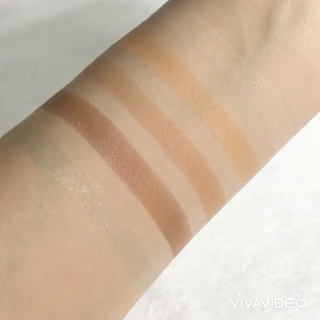 全体的には、名前のとおりヌーディーな印象☺️定番色「01 本命のブラウン」と似てるんだけど、今回の「104 本能のヌードベージュ」の方が、よりヌーディーなカラーとなっておりまする💁🏻♀️ 左上のベージュカラー(1番)は、基本的にはマットカラーなんだけど、ほんのりラメも入ってるから、のっぺりとした印象にならなくて良き🥰 4番のカラーは、ハイライトとして使うこともできるし、個人的には涙袋に使っても良いのではないかと思っておりまする👻 こちらは、全体的にしっとりとしたテクスチャーとなっておりまする💖そして、上2色のマットカラーが、結構しっかり発色してくれます❣️ 右下のハイライトカラーも、「104 本能のヌードベージュ」ほど白っぽくならないので、さりげなくハイライトを入れたい人にピッタリ✨