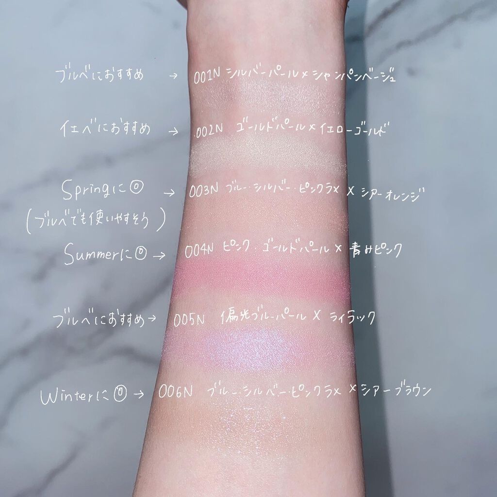 - <001N Beyond Light> 窒化ホウ素、ホウケイ酸(Ca/AI)、合成金雲母、ワセリン、ジカプリン酸PG、ミネラルオイル、デシルテトラデカノール、リンゴ酸ジイソステアリル、テトラエチルヘキサン酸ペンタエリスリチル、(PEG-15/ラウリルジメチコン)クロスポリマー、オリーブ果実油、カニナバラ果実油、ゴマ種子油、ジパルミチン酸アスコルビル、トコフェロール、ホホバ種子油、DPG、アミノプロピルトリエトキシシラン、アモジメチコン、イソドデカン、エチルセルロース、オクチルドデカノール、クエン酸Na、ジメチコノール、タルク、ハイドロゲンジメチコン、合成ワックス、マイカ、酸化チタン、酸化亜鉛、酸化鉄 <002N Golden Eden> 窒化ホウ素、タルク、ホウケイ酸(Ca/Al)、合成金雲母、ワセリン、ジカプリン酸PG、ミネラルオイル、デシルテトラデカノール、リンゴ酸ジイソステアリル、テトラエチルヘキサン酸ペンタエリスリチル、(PEG-15/ラウリルジメチコン) クロスポリマー、オリーブ果実油、カニナバラ果実油、ゴマ種子油、ジパルミチン酸アスコルビル、トコフェロール、ホホバ種子油、DPG、アミノプロピルトリエトキシシラン、アモジメチコン、イソドデカン、エチルセルロース、オクチルドデカノール、クエン酸Na、ジメチコノール、ハイドロゲンジメチコン、合成ワックス、酸化スズ、水酸化AI、グンジョウ、マイカ、酸化チタン、酸化亜鉛、酸化鉄 <003N Color Me Sky> 窒化ホウ素、合成金雲母、タルク、ホウケイ酸(Ca/Al)、(HDI/PPG/ポリカプロラクトン) クロスポリマー、ワセリン、ジカプリン酸PG、ミネラルオイル、デシルテトラデカノール、リンゴ酸ジイソステアリル、テトラエチルヘキサン酸ペンタエリスリチル、(PEG-15/ラウリルジメチコン)クロスポリマー、オリーブ果実油、カニナバラ果実油、ゴマ種子油、ジパルミチン酸アスコルビル、トコフェロール、ホホバ種子油、DPG、アミノプロピルトリエトキシシラン、アモジメチコン、イソドデカン、エチルセルロース、オクチルドデカノール、クエン酸Na、シリカ、ジメチコノール、ハイドロゲンジメチコン、合成ワックス、酸化スズ、マイカ、酸化チタン、酸化亜鉛、酸化鉄、黄4、赤226 <004N Pink Bliss> 窒化ホウ素、タルク、合成金雲母、ワセリン、ジカプリン酸PG、ミネラルオイル、デシルテトラデカノール、リンゴ酸ジイソステアリル、(HDI/PPG/ポリカプロラクトン)クロスポリマー、テトラエチルへキサン酸ペンタエリスリチル、(PEG-15/ラウリルジメチコン)クロスポリマー、オリーブ果実油、カニナバラ果実油、ゴマ種子油、ジパルミチン酸アスコルビル、トコフェロール、ホホバ種子油、DPG、アミノプロピルトリエトキシシラン、アモジメチコン、イソドデカン、エチルセルロース、オクチルドデカノール、クエン酸Na、シリカ、ジメチコノール、ハイドロゲンジメチ コン、合成ワックス、酸化スズ、グンジョウ、マイカ、酸化チタン、酸化亜鉛、酸化鉄、赤226 <005N Aurora Veil> 窒化ホウ素、合成金雲母、タルク、ワセリン、ジカプリン酸PG、ミネラルオイル、(HDI/PPG/ポリカプロラクトン) クロスポリマー、デシルテトラデカノール、リンゴ酸ジイソステアリル、テトラエチルへキサン酸ペンタエリスリチル、(PEG-15/ラウリルジメチコン)クロスポリマー、オリーブ果実油、カニナバラ果実油、ゴマ種子油、ジパルミチン酸アスコルビル、トコフェロール、ホホバ種子油、DPG、アミノプロピルトリエトキシシラン、アモジメチコン、イソドデカン、エチルセルロース、オクチルドデカノール、クエン酸Na、シリカ、ジメチコノール、ハイドロゲンジメチ コン、合成ワックス、酸化スズ、グンジョウ、マイカ、酸化チタン、酸化亜鉛、酸化鉄、赤226 <006N Stellar Dust> タルク、リンゴ酸ジイソステアリル、合成金雲母、トリエチルヘキサノイン、ホウケイ酸(Ca/Al)、メタクリル酸メチルクロスポリマー、エチルヘキサン酸セチル、ミネラルオイル、ヘキサ(ヒドロキシステアリン酸/ステアリン酸/ロジン酸)ジペンタエリスリチル、オリーブ果実油、カニナバラ果実油、ゴマ種子油、ジパルミチン酸アスコルビル、トコフェロール、ホホバ種子油、アミノプロピルトリエトキシシラン、アモジメチコン、イソドデカン、シリカ、ジメチコノール、ワセリン、酸化スズ、グンジョウ、マイカ、酸化チタン、酸化亜鉛、酸化鉄 <101N Sun Longing> タルク、リンゴ酸ジイソステアリル、ホウケイ酸(Ca/Al)、トリエチルヘキサノイン、メタクリル酸メチルクロスポリマー、エチルヘキサン酸セチル、ミネラルオイル、ヘキサ(ヒドロキシステアリン酸/ステアリン酸/ロジン酸)ジペンタエリスリチル、オリーブ果実油、カニナバラ果実油、ゴマ種子油、ジパルミチン酸アスコルビル、トコフェロール、ホホバ種子油、アミノプロピルトリエトキシシラン、アモジメチコン、イソドデカン、シリカ、ジメチコノール、ワセリン、酸化スズ、マイカ、酸化チタン、酸化亜鉛、酸化鉄